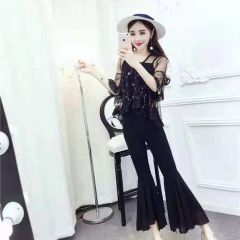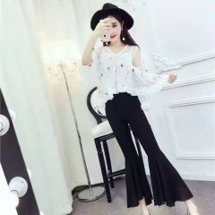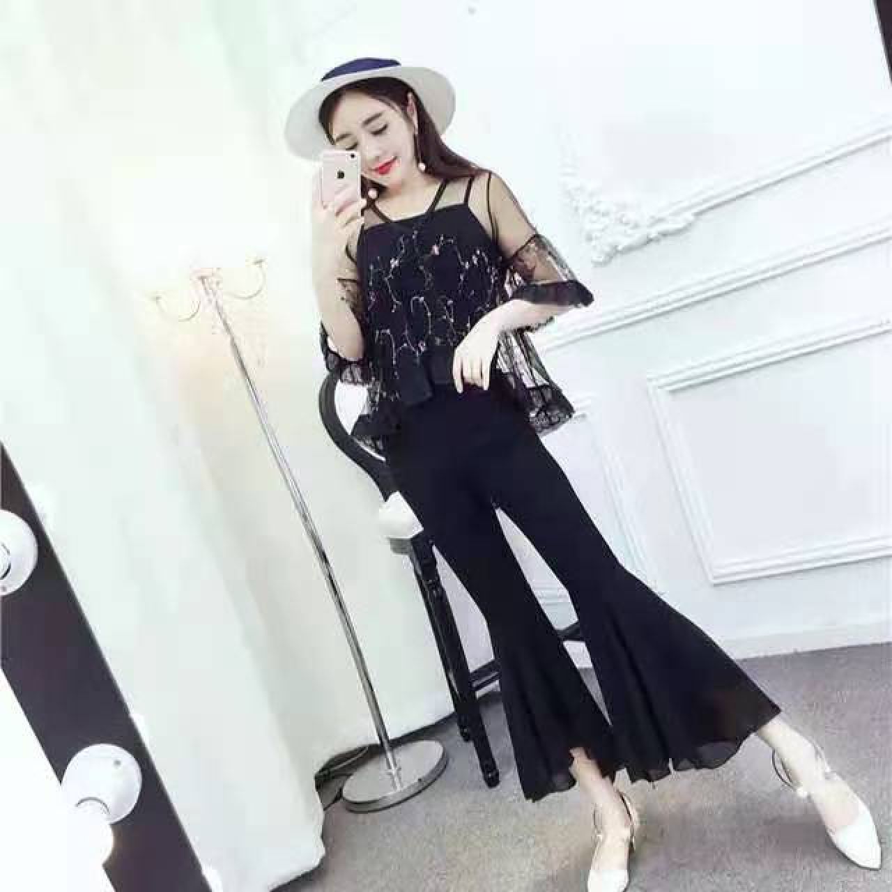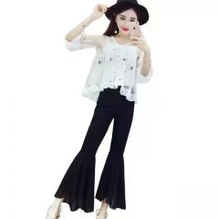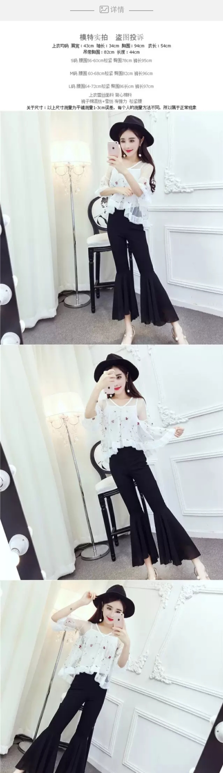 蔚缇2017夏季小花网纱+吊带+喇叭裤三件套女