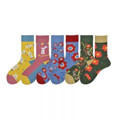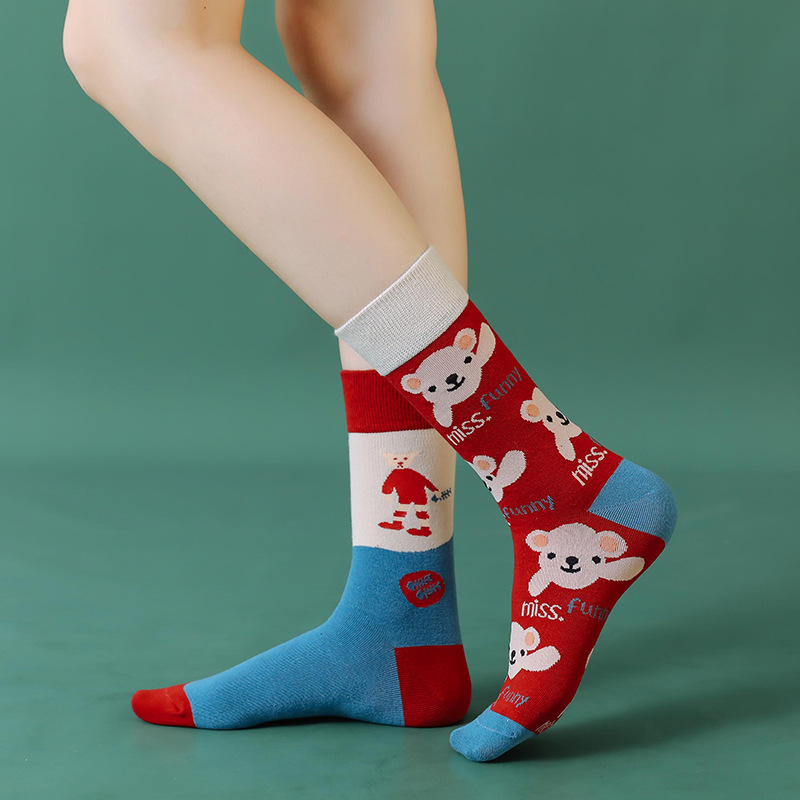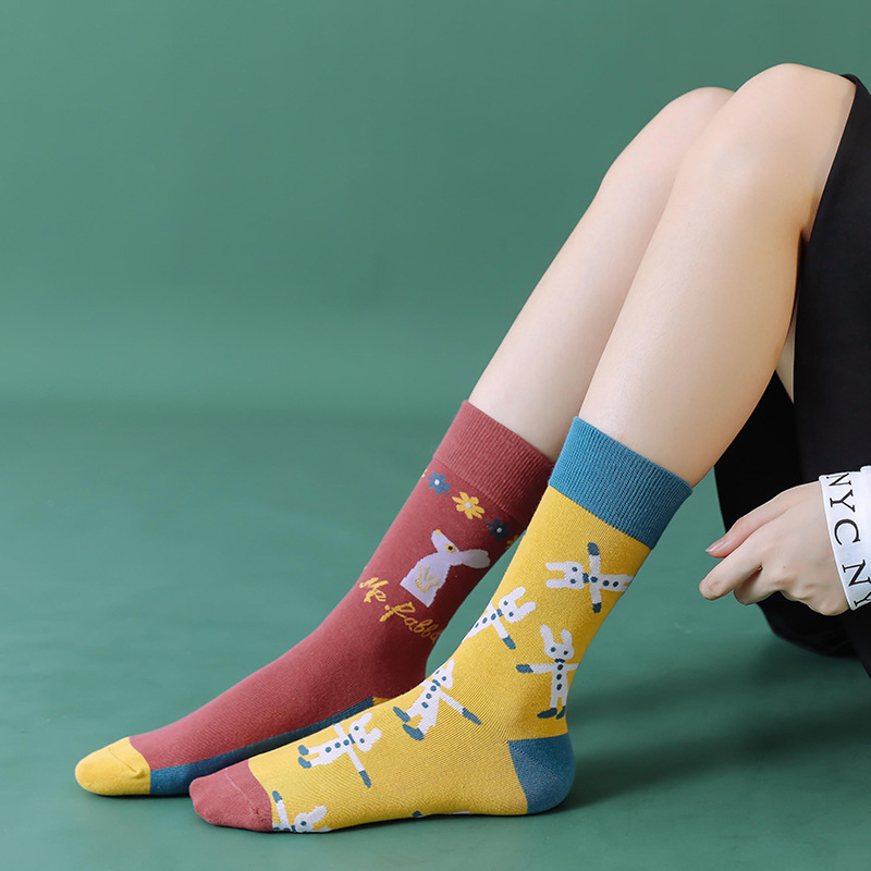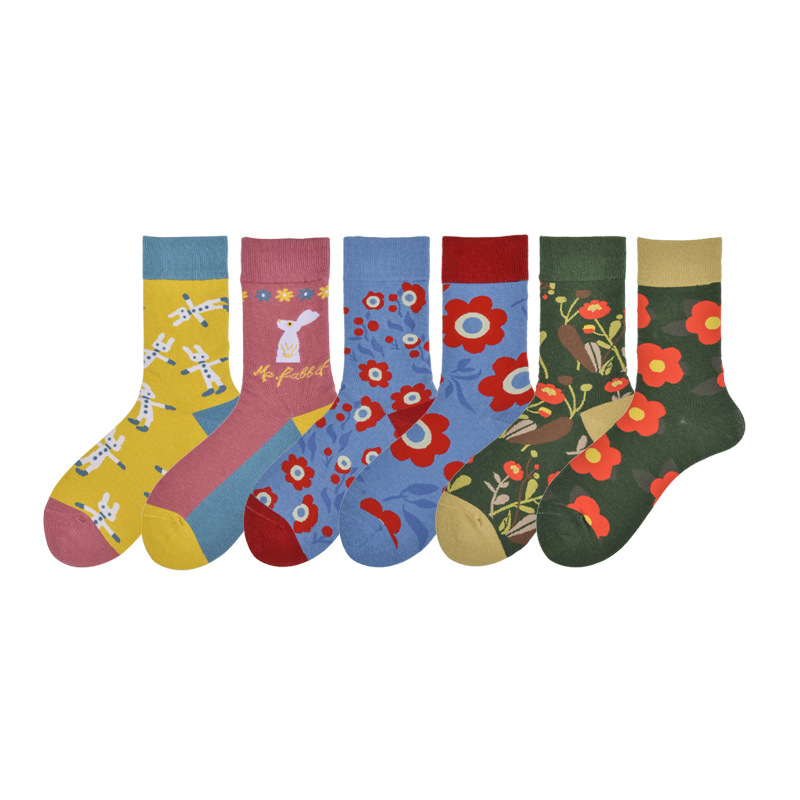 潮袜子AB款全棉中高筒袜创意卡通小花新款秋冬长筒袜女袜子批发