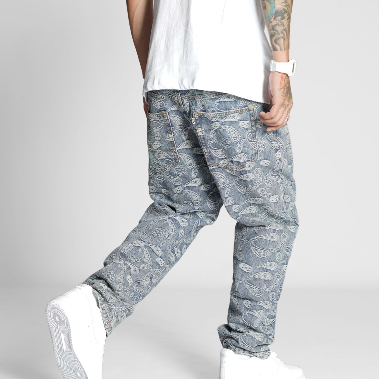 牛仔面料经过水洗后呈现令人舒适的浅蓝色复古质感图案设计.上融合了具有代表美国街头风格的腰果花图案.老爹裤裤型