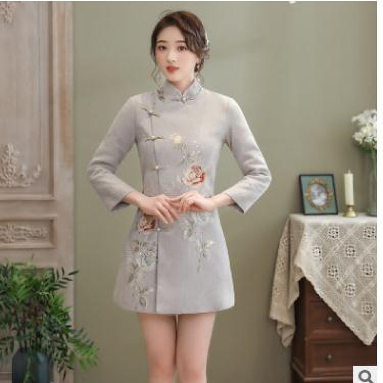 2020冬季中式棉衣旗袍国风复古棉中长款灰色兔毛(可拆)夹棉棉服