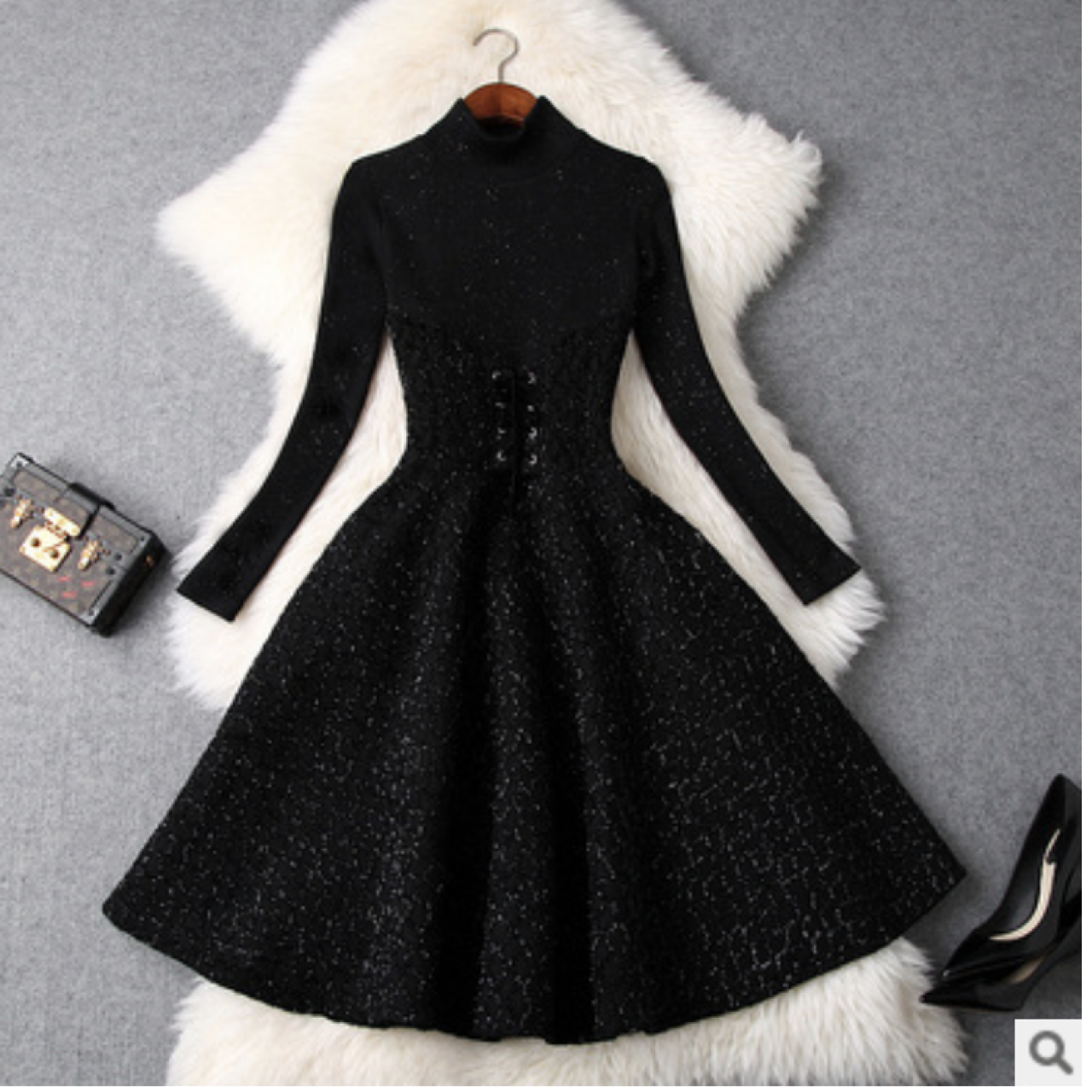 2018秋冬女装新款半高领亮丝针织拼绑带收腰气质大摆连衣裙T9249