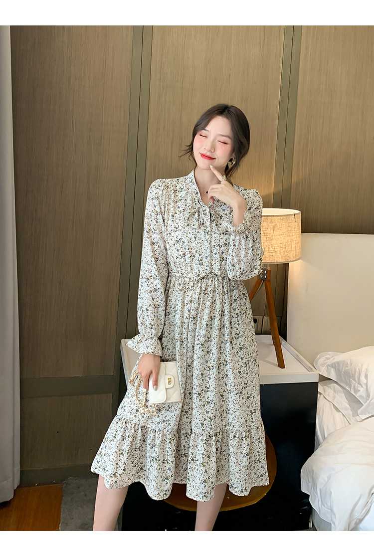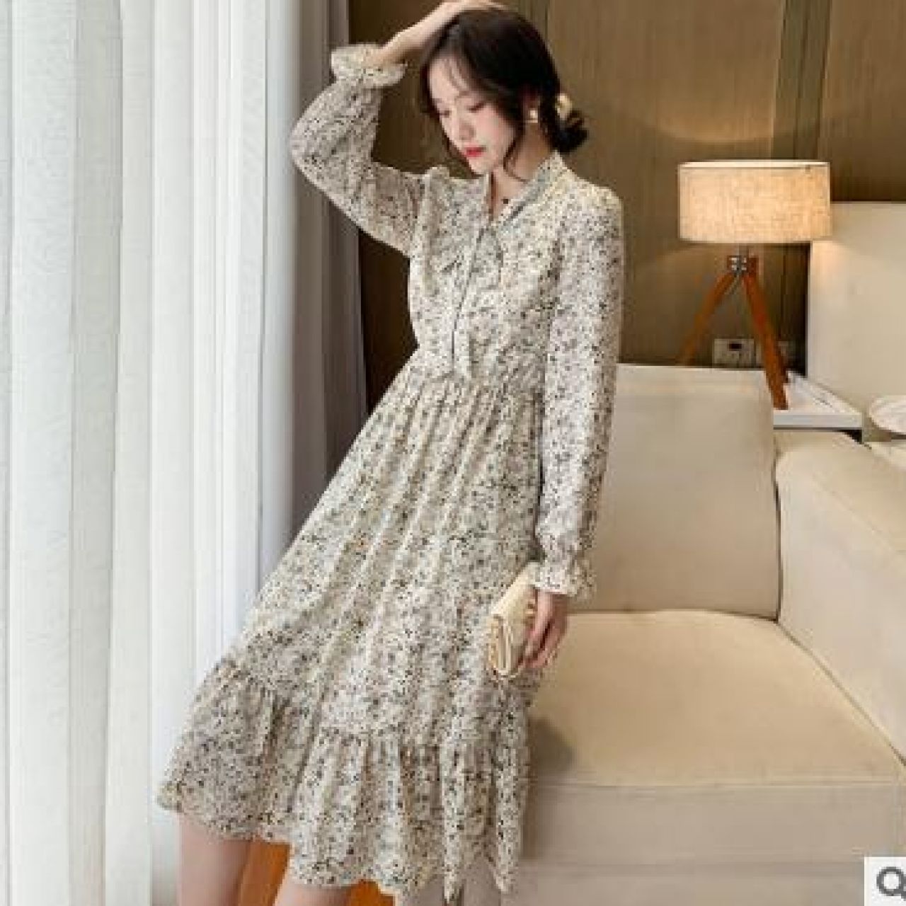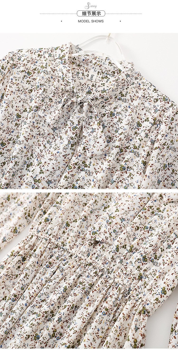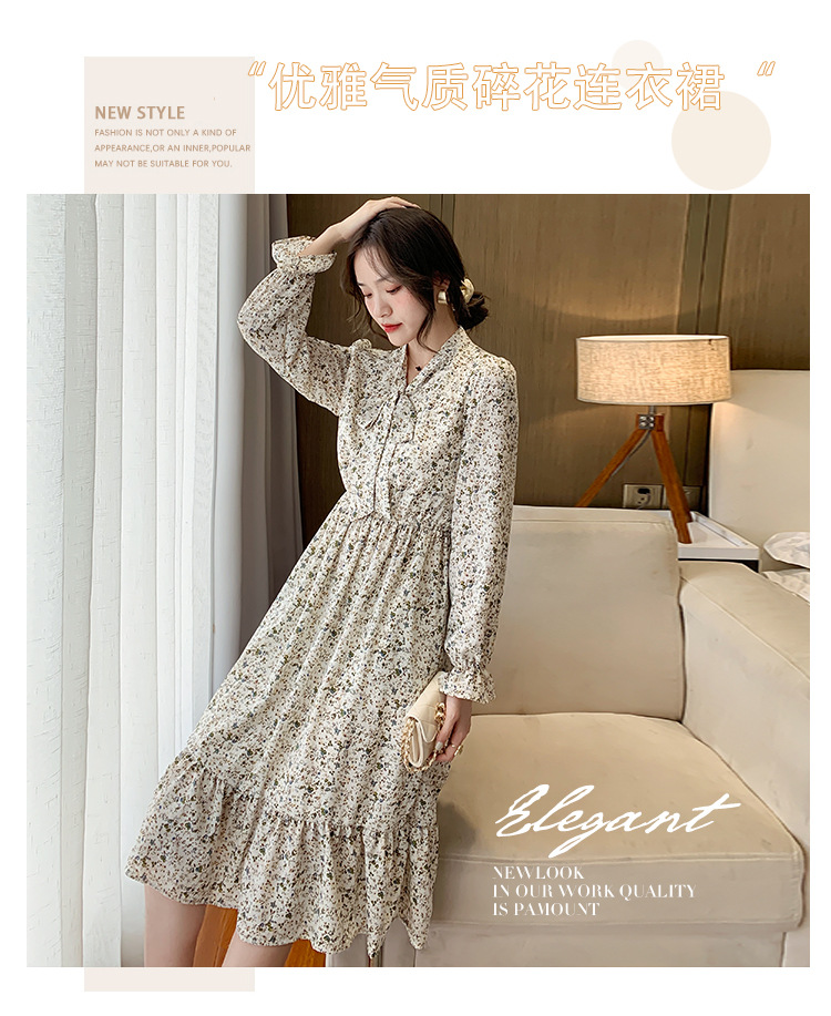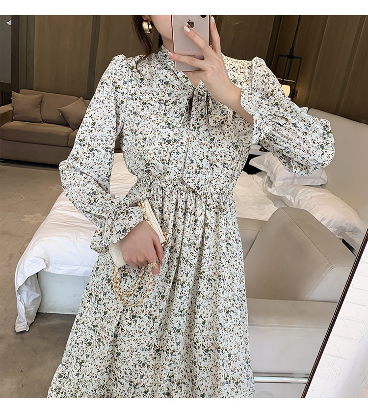 实拍优质现货韩版碎花雪纺连衣裙女长袖春秋中长款收腰显瘦打底裙