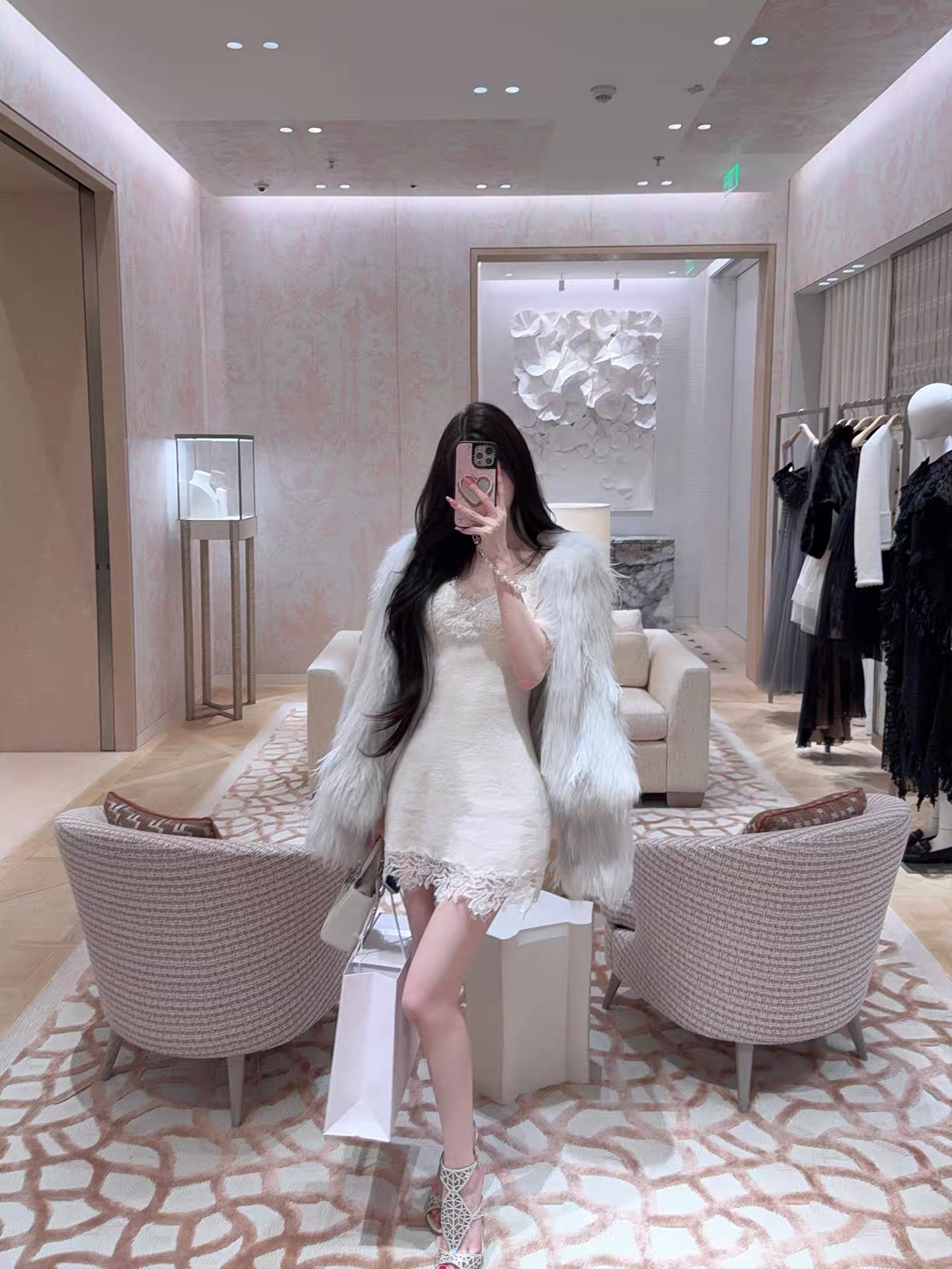 • 萌萌家 冬日限定蕾丝 皮草大衣的内搭裙 厚款浮雕蕾丝面料 短裙 定染奶白色 s码