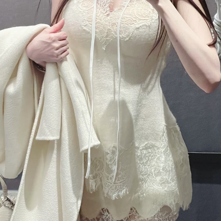 • 萌萌家 钉珠蕾丝羊毛吊带内搭裙女秋冬收腰显瘦性感气质白色连衣裙 短裙 奶白色 s码