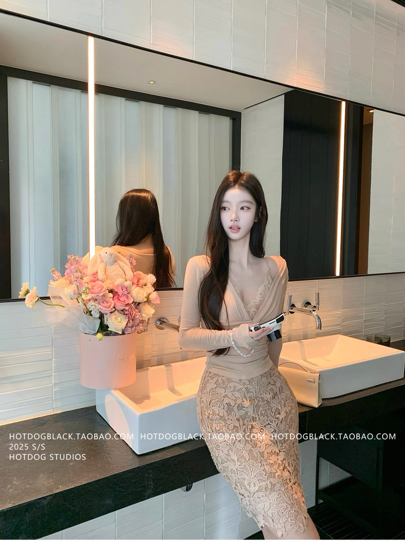 这套搭配自带氤氲朦胧的氛围在设计感上这件也是完全不甘于平淡完全没有常规纱线的膨胀感穿在身上毫无负担上身存在感很低 贴肤不扎包裹性强是很温润松弛的存在版型也是相对贴合人体曲线此外还调整了很多次线条肌理感上身曲线毕露 很撩人有呼吸余量的同时腰线收的很曼妙