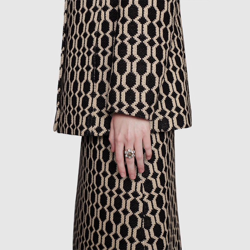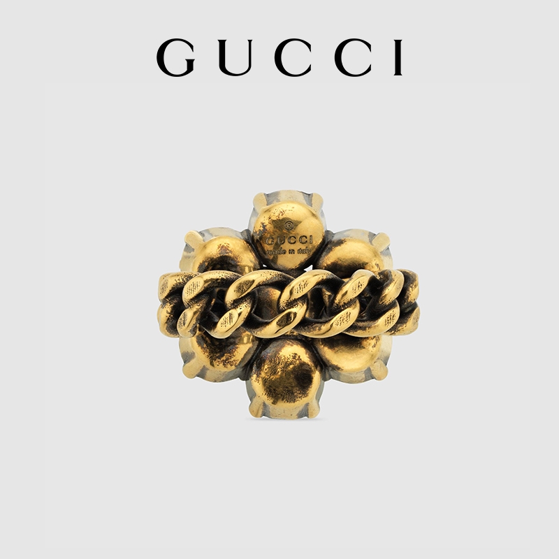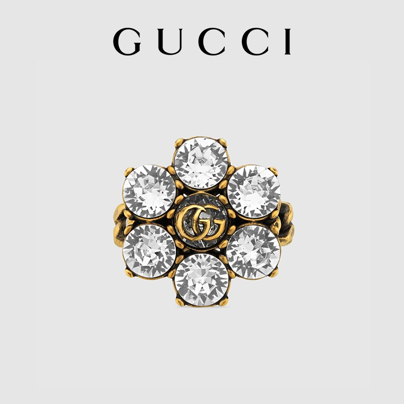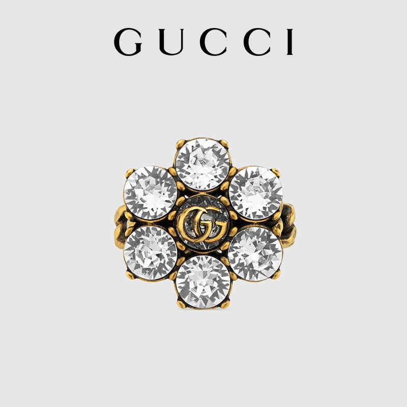[新品]GUCCI古驰水晶双G女士戒指做旧金色效果的金属标识与透明水晶边框,令整款设计更显雅典的气息