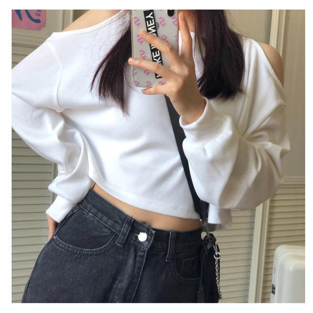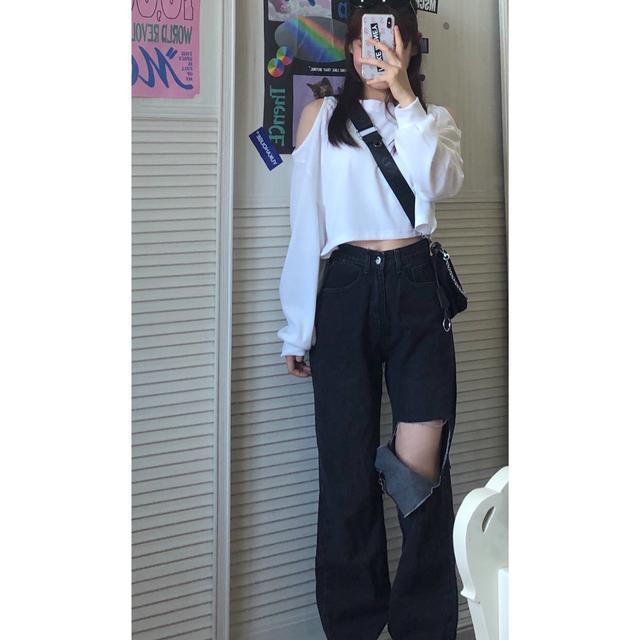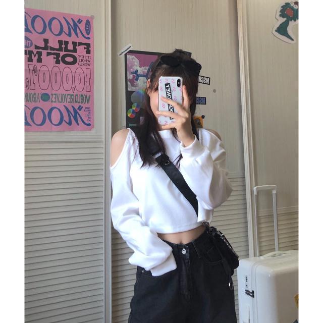 两单件套装学生韩风chic温柔简约露肩长袖卫衣+高腰牛仔破洞裤女