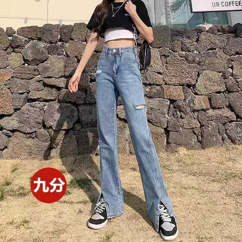 破洞牛仔裤女高腰2021年春夏新款直筒宽松阔腿开叉垂感微喇拖地裤