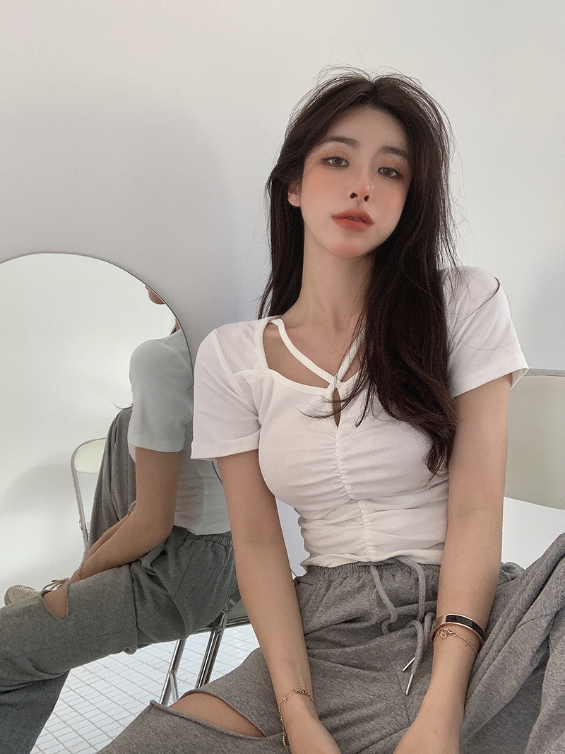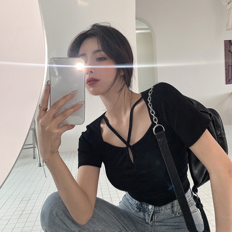 T恤女装夏季设计感交叉短款性感紧身方领2021年新款灰色短袖上衣