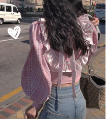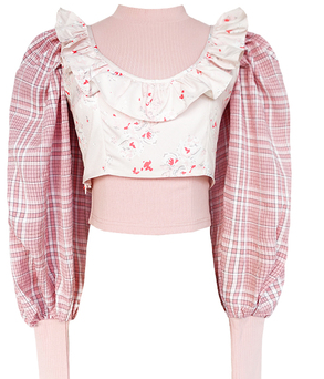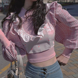 李热闹 敲大袖子碎花两件套T恤少女圆领套头长袖打底衫上衣