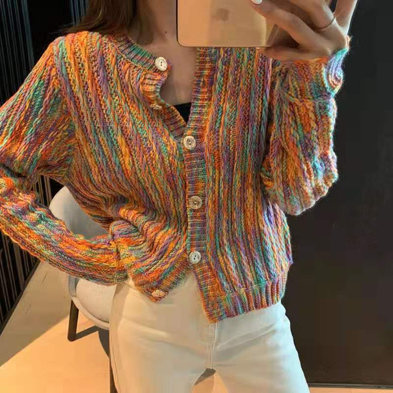 泫雅风彩虹撞色毛衣开衫外套短款上衣女宽松慵懒风针织衫披肩外搭