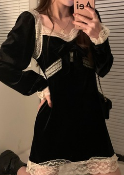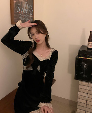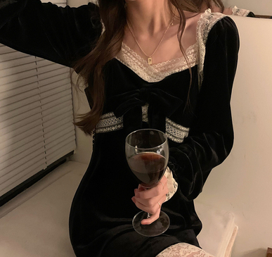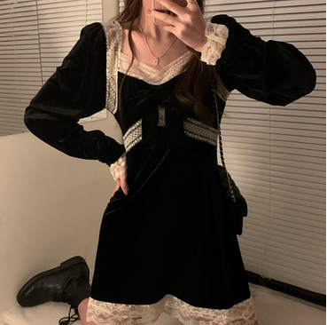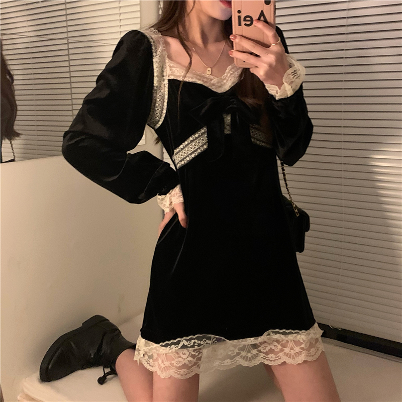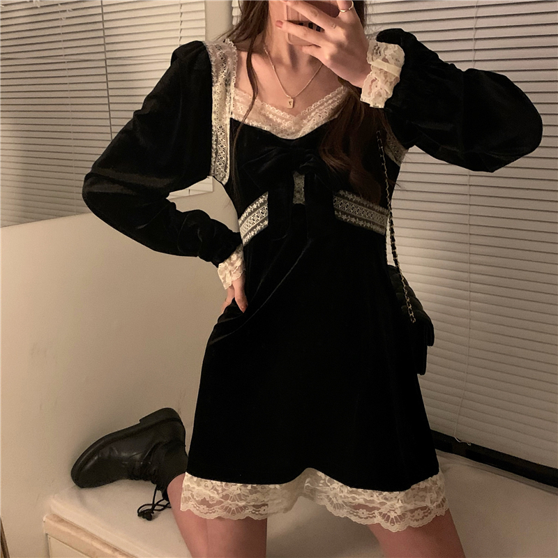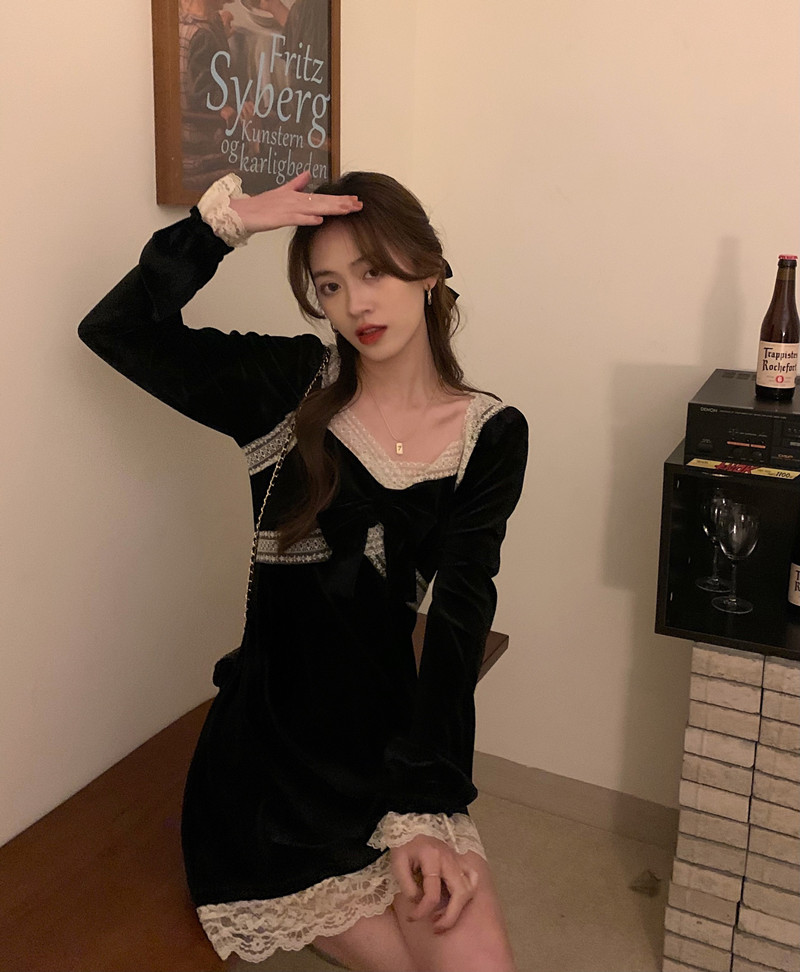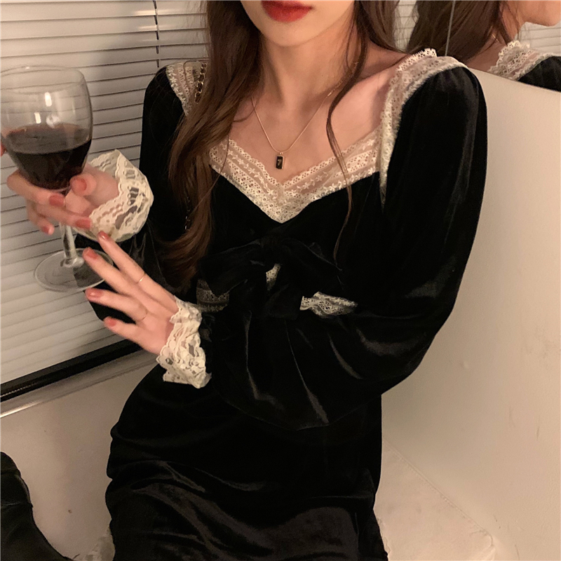 YUMMY韩风chic鬼马气质百搭修身设计感蕾丝花边拼接金丝绒小黑裙