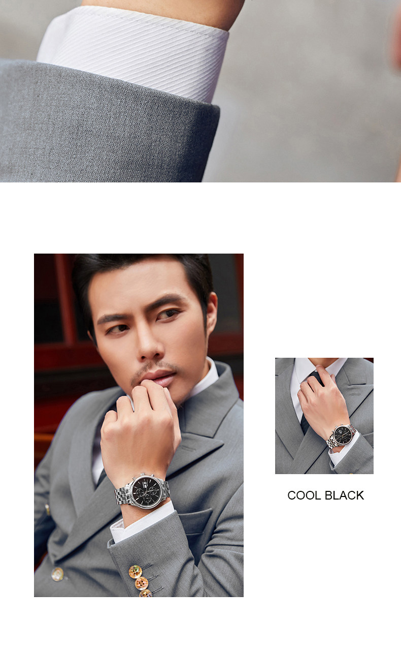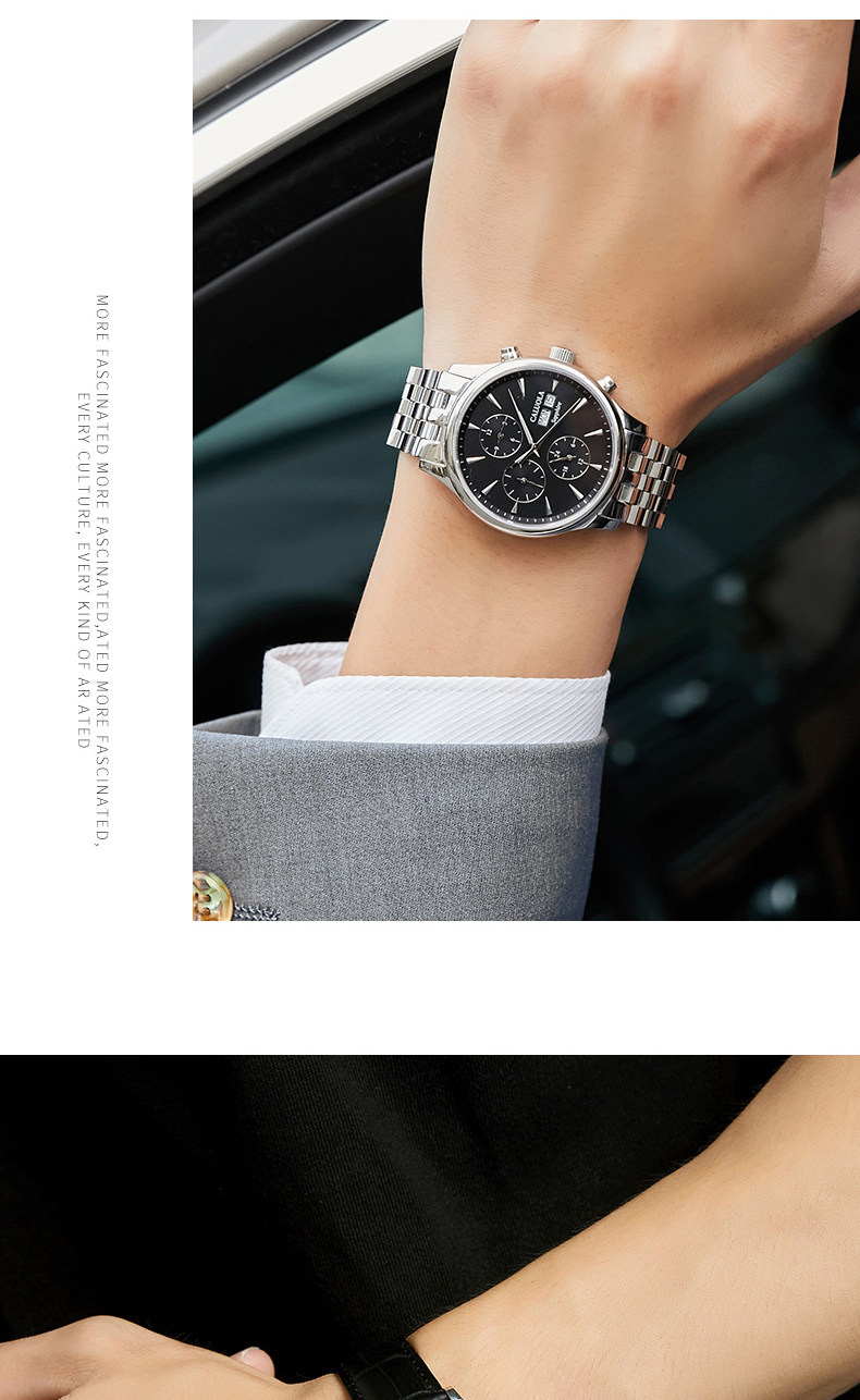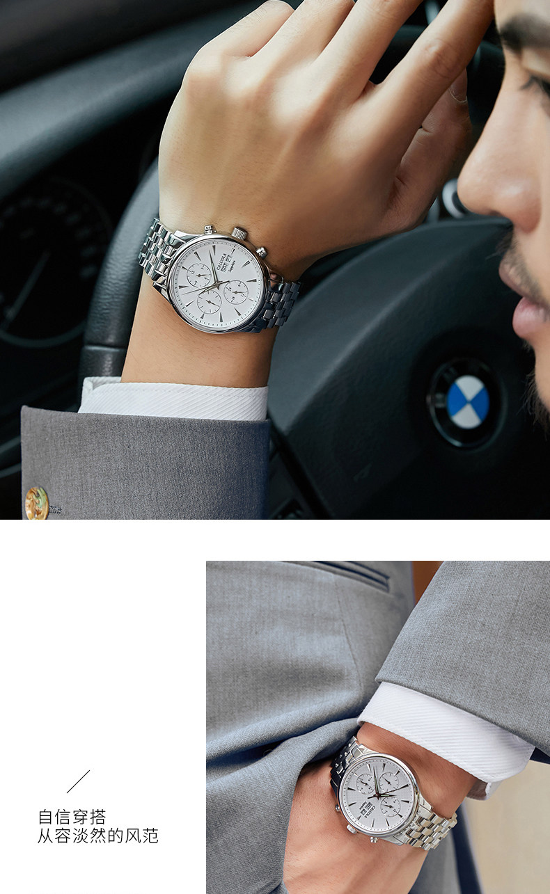 防水深度: 5ATM 附加功能: 24小时指示 日历 小三针 星期显示 月份显示 表扣款式: 蝴蝶双按扣表底类型: 透底 表冠类型: 普通