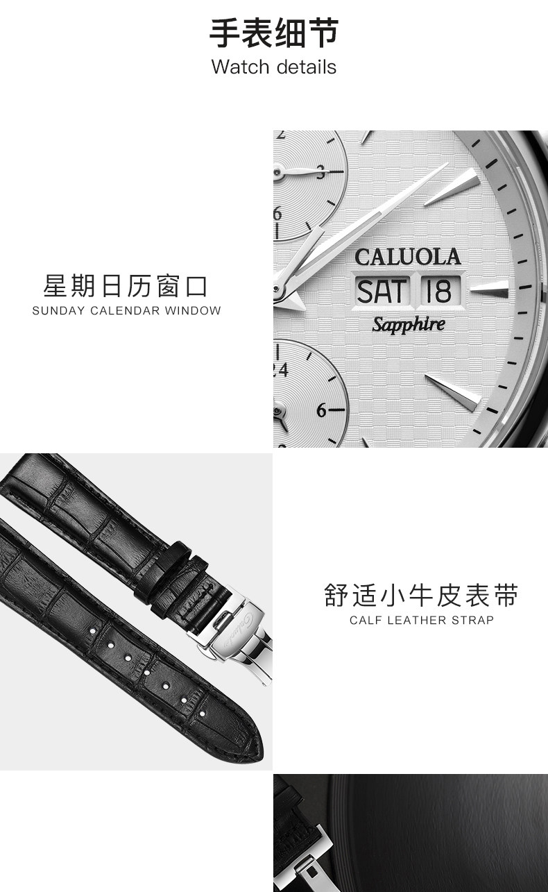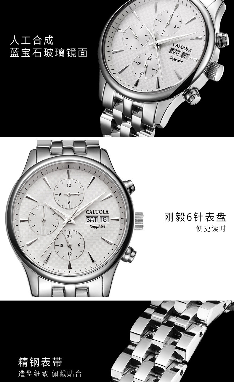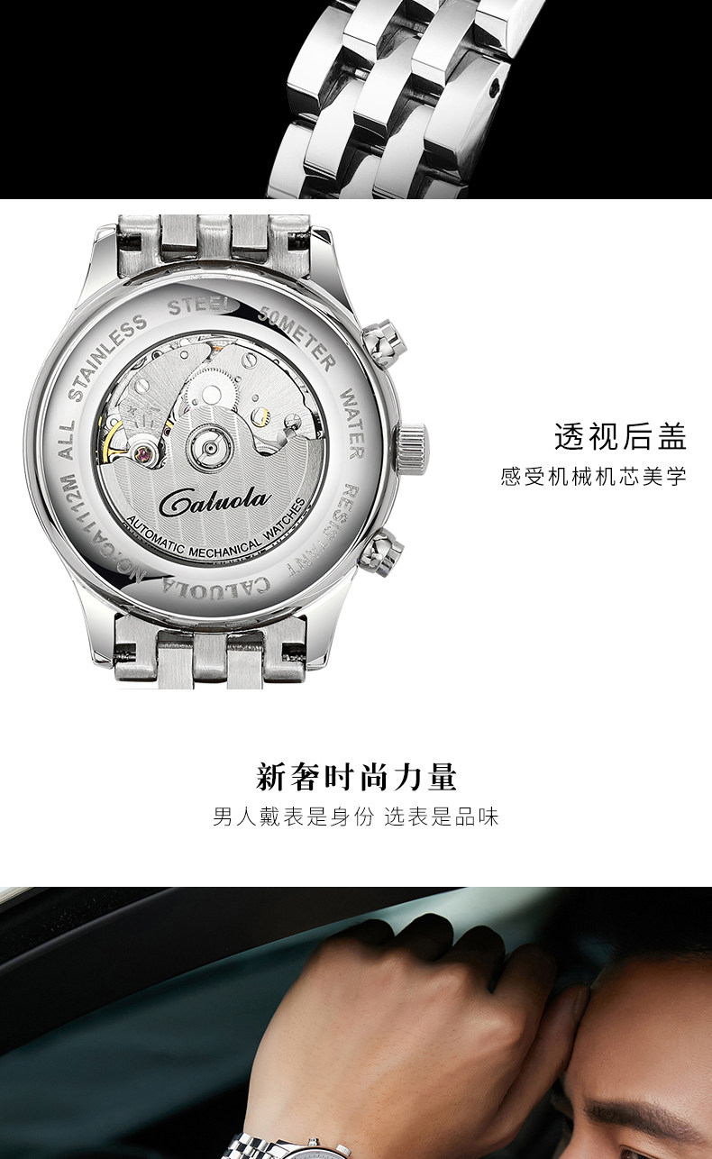 品牌名称:CALUOLA/卡罗莱 产品参数:保修: 全国联保成色: 全新 手表镜面材质: 人工合成蓝宝石表镜 是否商场同款: 是 品牌: CALUOLA/卡罗莱 型号: CA1112M 机芯类型: 机械机芯-自动机械机芯 手表种类: 男 风格: 时尚 表带材质: 精钢 形状: 圆形