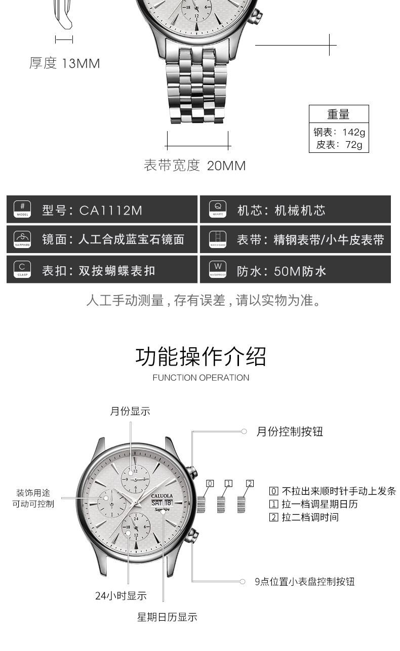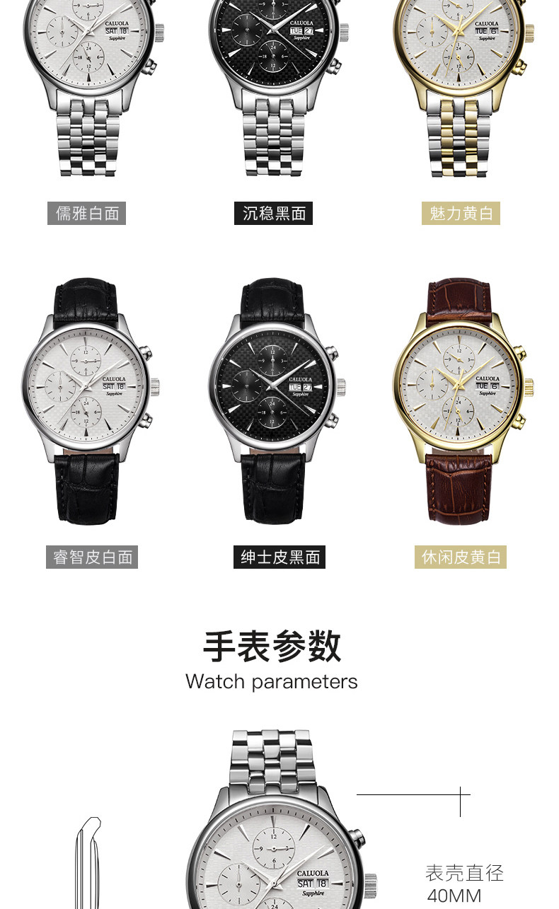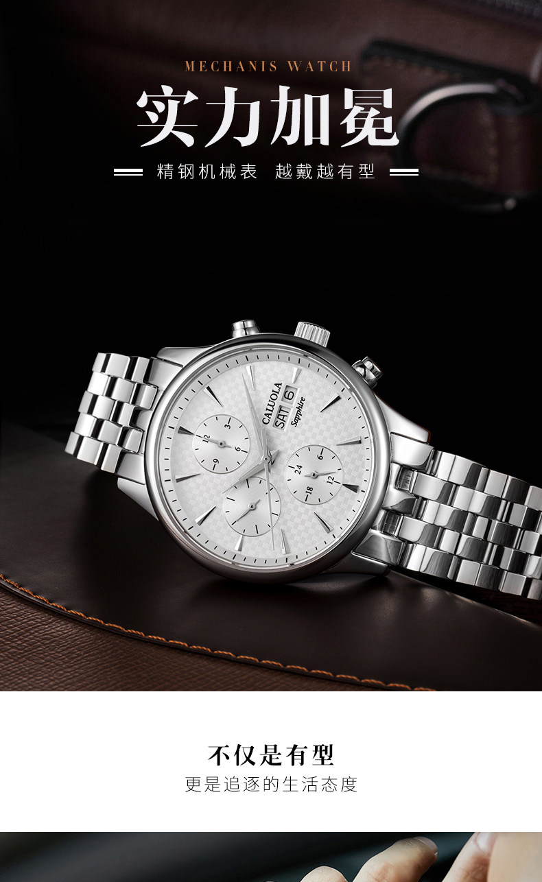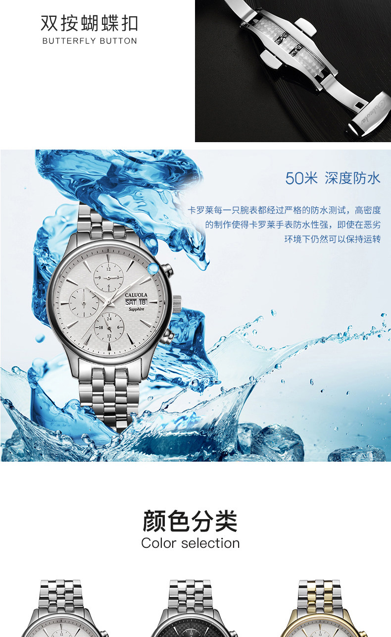 品牌名称:CALUOLA/卡罗莱 产品参数:保修: 全国联保成色: 全新 手表镜面材质: 人工合成蓝宝石表镜 是否商场同款: 是 品牌: CALUOLA/卡罗莱 型号: CA1112M 机芯类型: 机械机芯-自动机械机芯 手表种类: 男 风格: 时尚 表带材质: 精钢 形状: 圆形