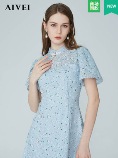 AIVEI欣贺艾薇2021夏季新品国风蕾丝钩花旗袍短裙连衣裙