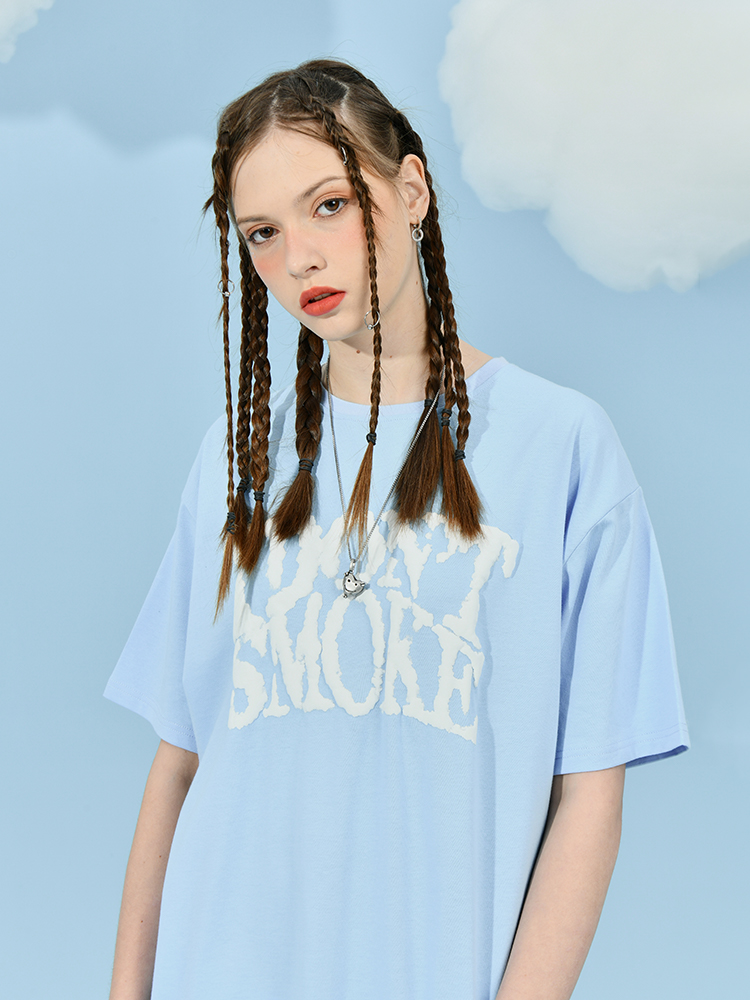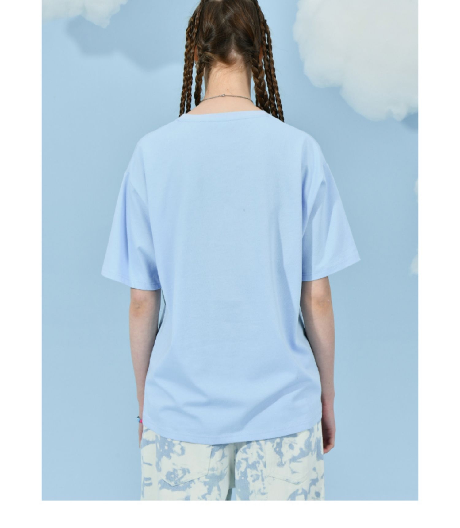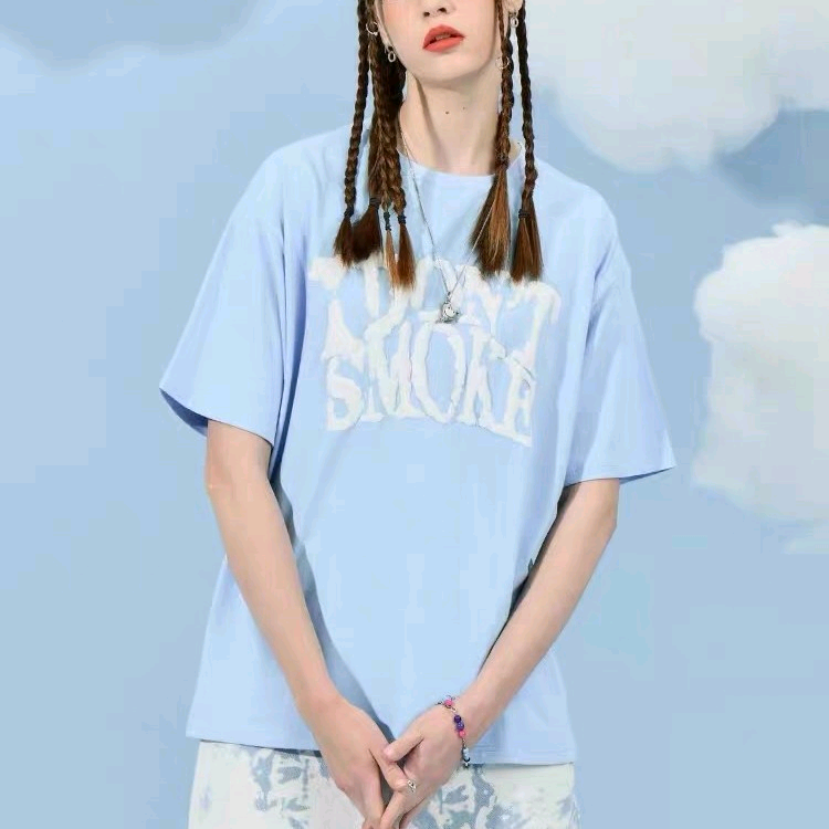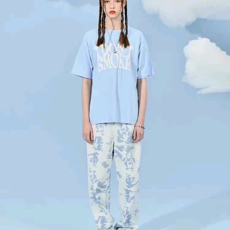 国潮蓝天白云朵印花宽松情侣少年感T恤短袖 L