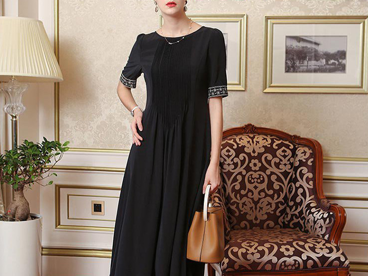 真丝双绉圆领绣花短袖收腰赫本黑色蕾丝连衣裙礼服宴会裙子