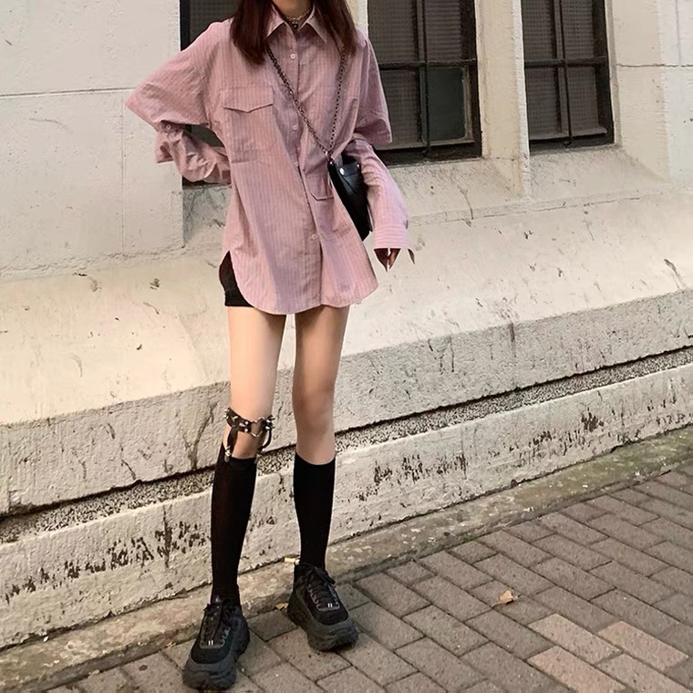 复古学生港风衬衫夏天设计感小众可拆卸袖衬衣条纹宽松甜酷上衣女 粉色 均码