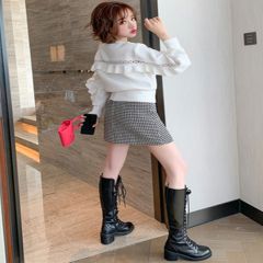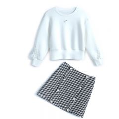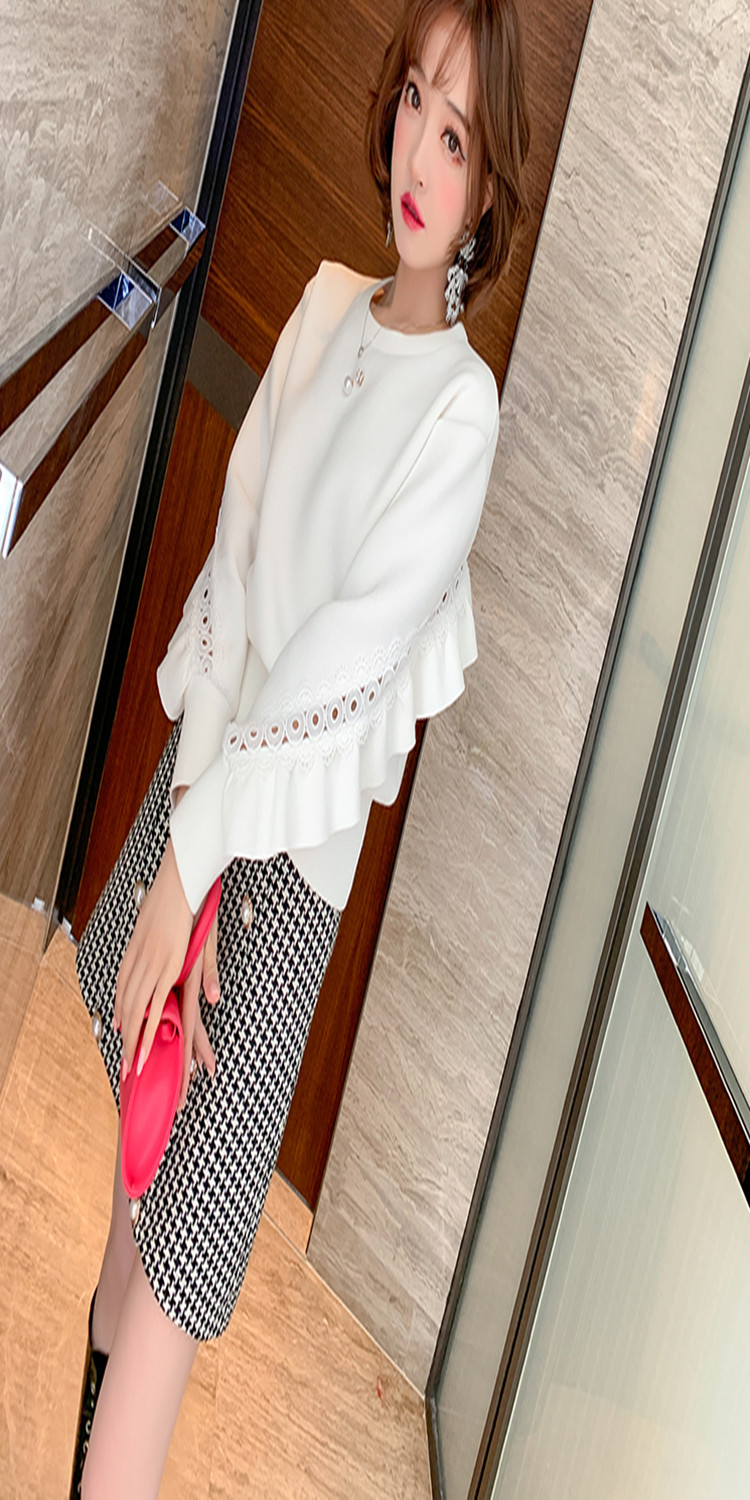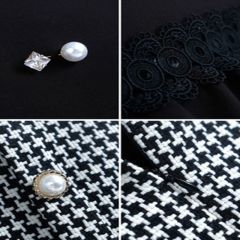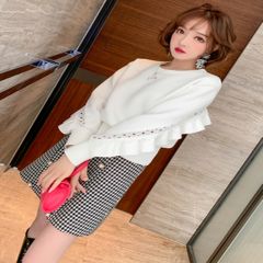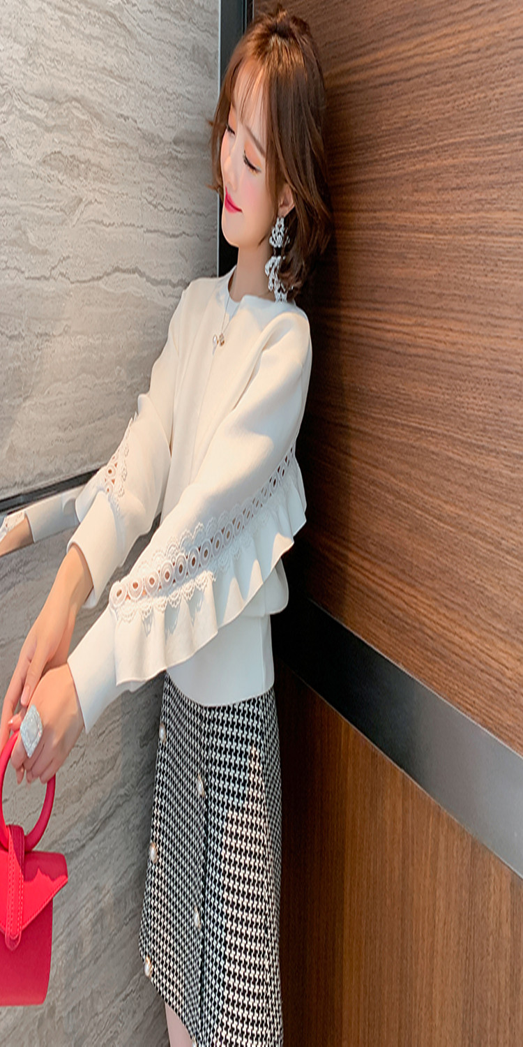 荷叶花边 镂空设计 气质圆领 双排珍珠扣 格纹半裙 A字版型