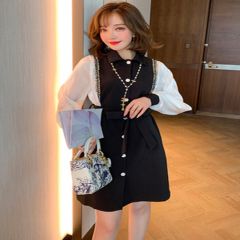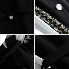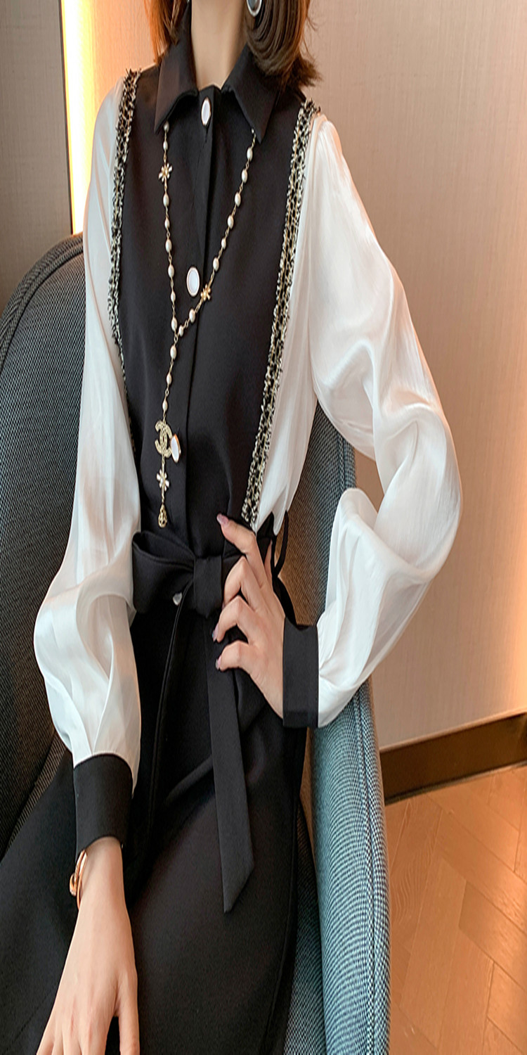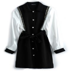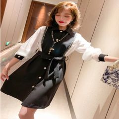 拼接撞色 流苏边装饰 前襟纽扣 收腰系带 高腰显瘦 连衣裙