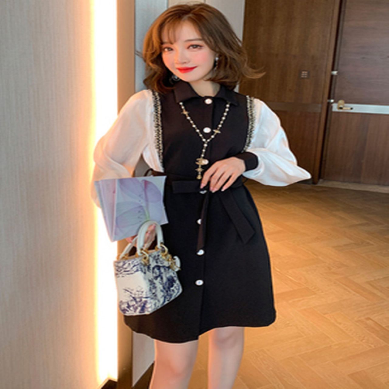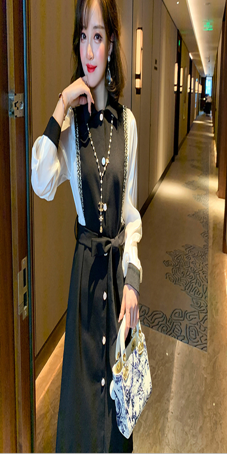 MIUCO撞色拼接流苏纽扣前襟收腰系带显瘦连衣裙女装2020秋冬新款