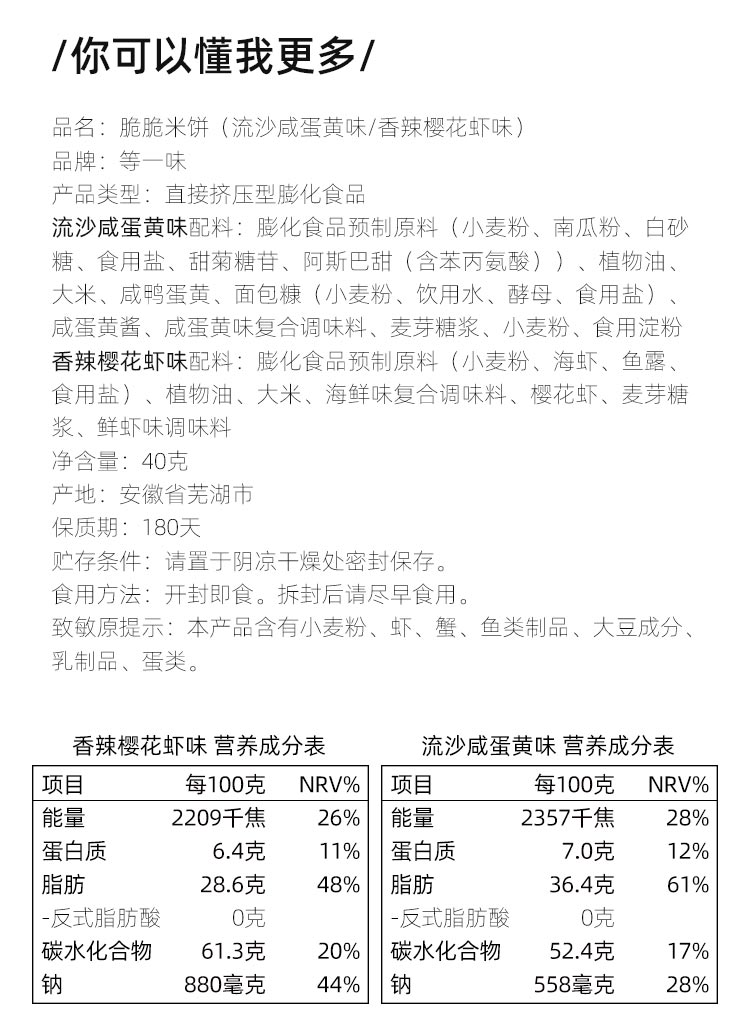 口味: 香辣樱花虾味 流沙咸蛋黄味
