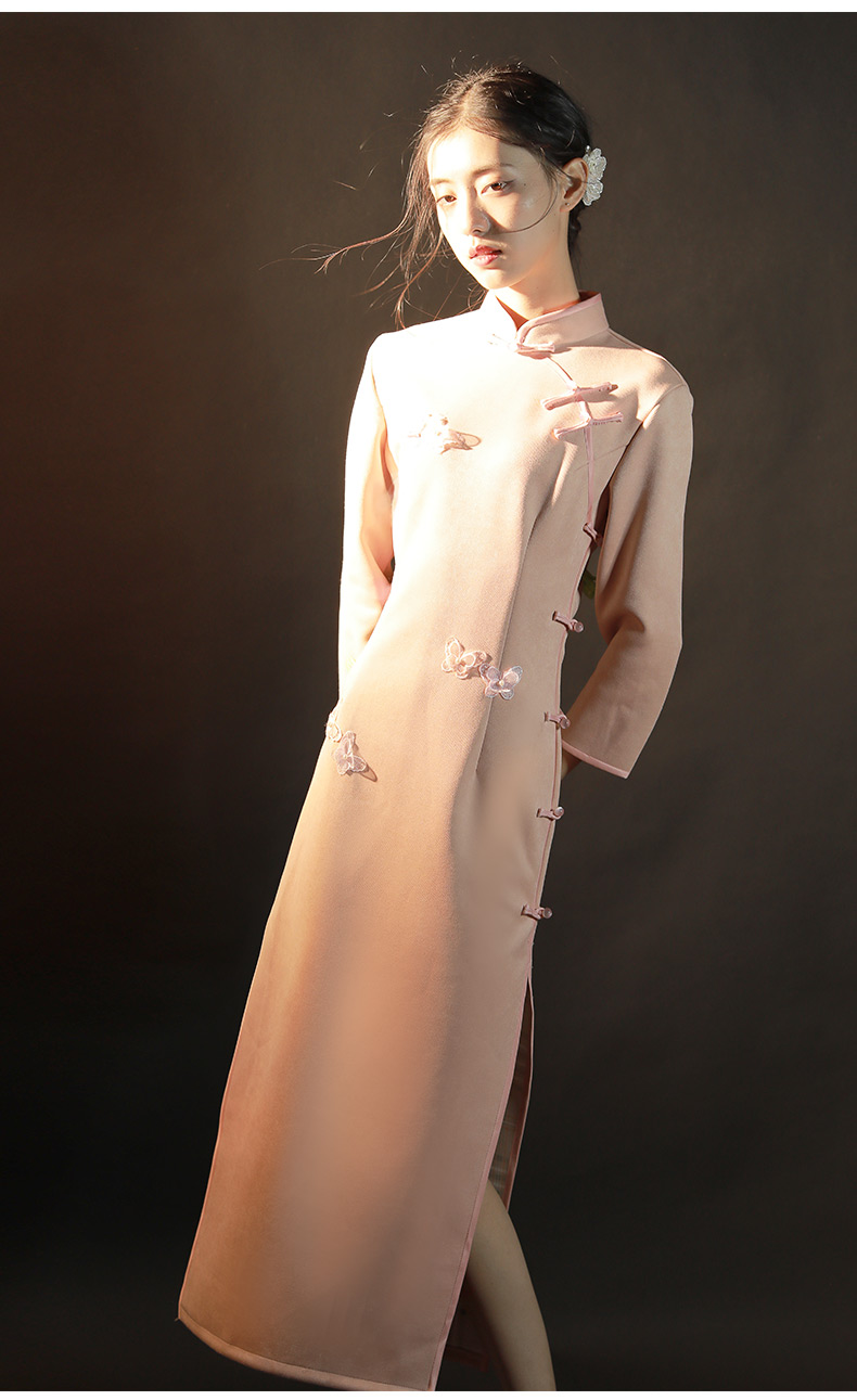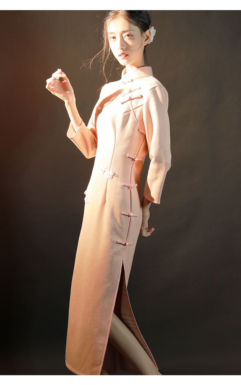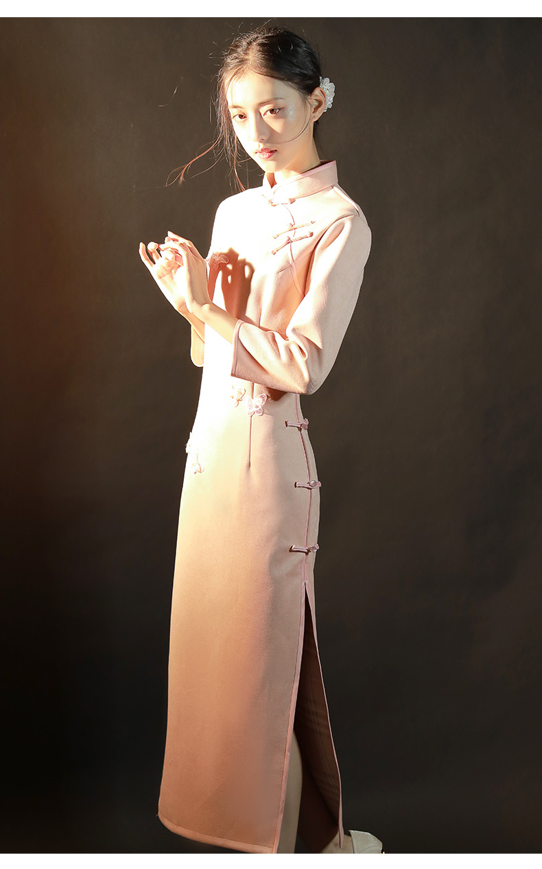 粉色毛呢旗袍年轻款冬款加厚少女改良气质中国风加绒长款秋冬长袖
