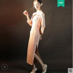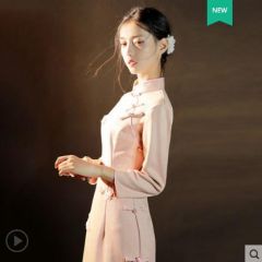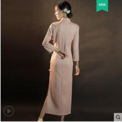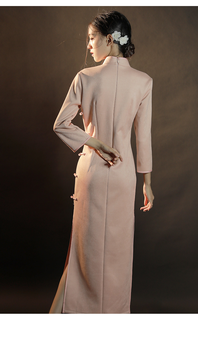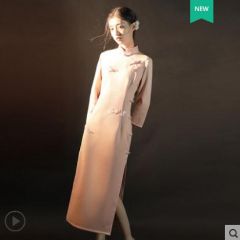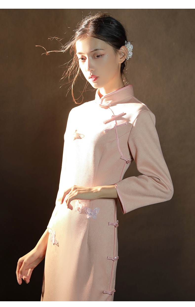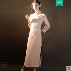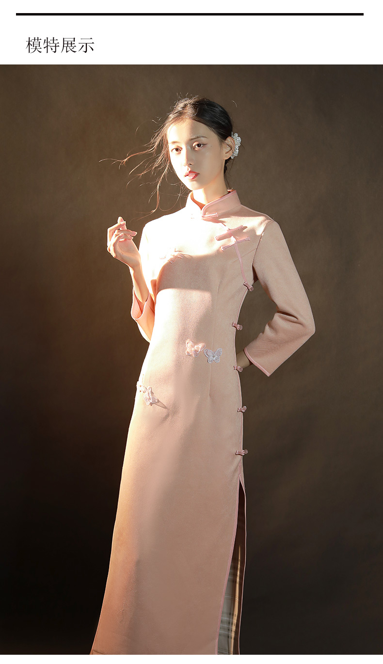 粉色毛呢旗袍年轻款冬款加厚少女改良气质中国风加绒长款秋冬长袖