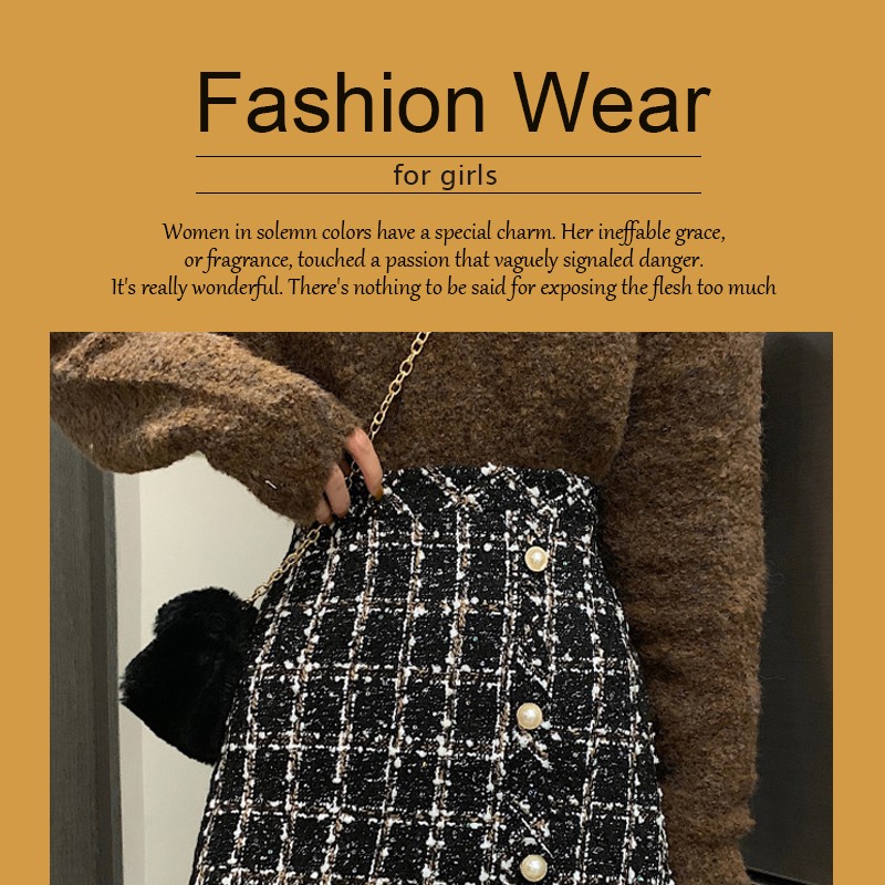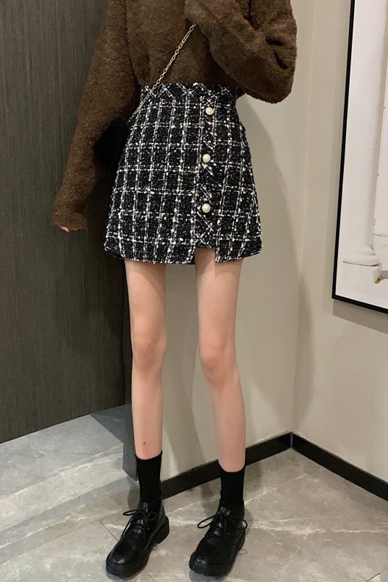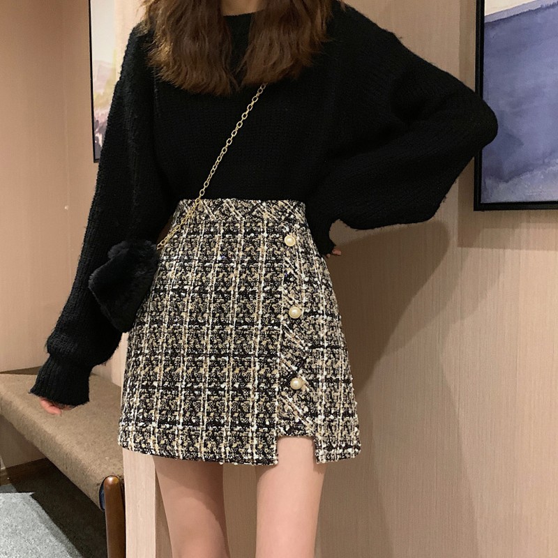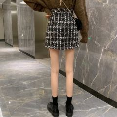 洽淮半身裙女装小香风高腰格子半身裙秋冬女2020新款黑色毛呢包臀不规则a字短裙