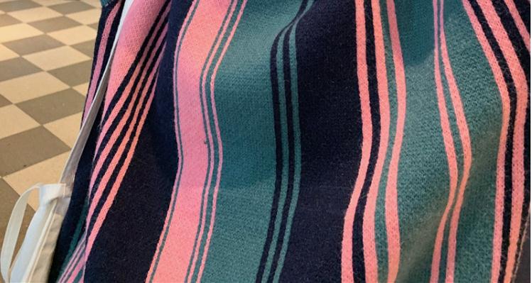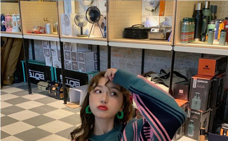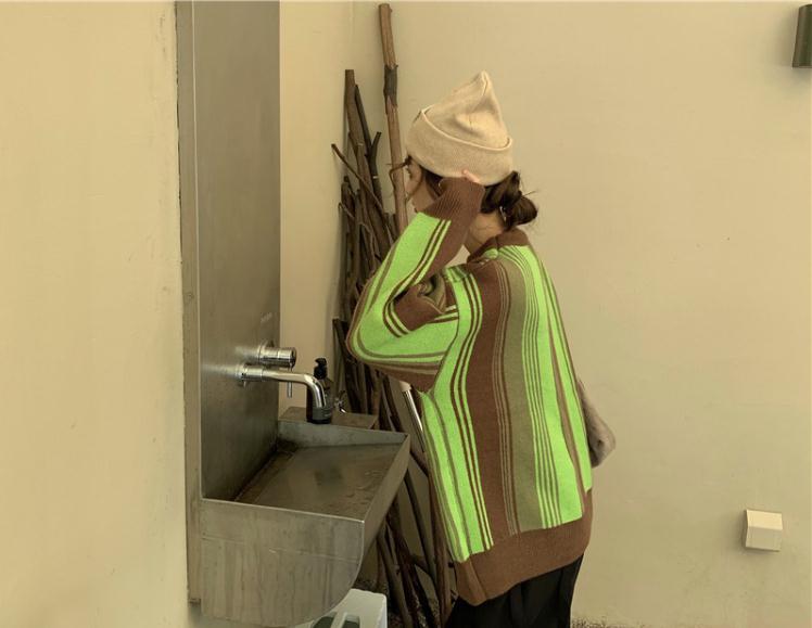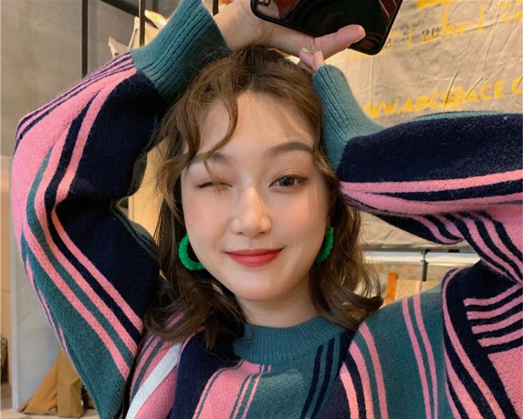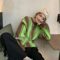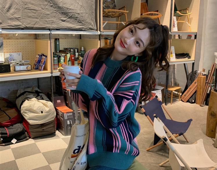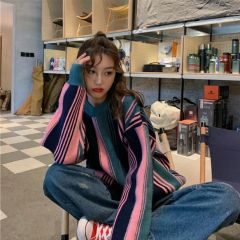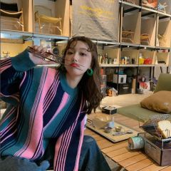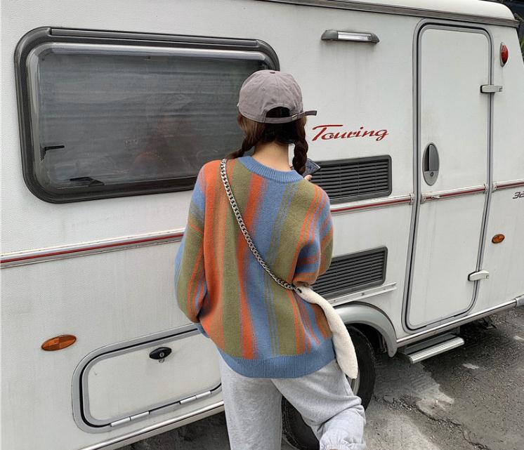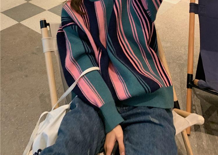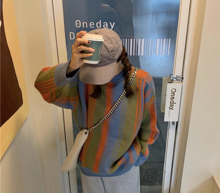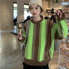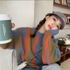 [与恩君]A3497韩风chic 简约宽松慵懒风撞色拼接条纹圆领女装毛衣
