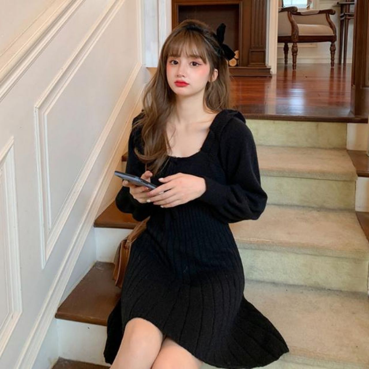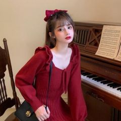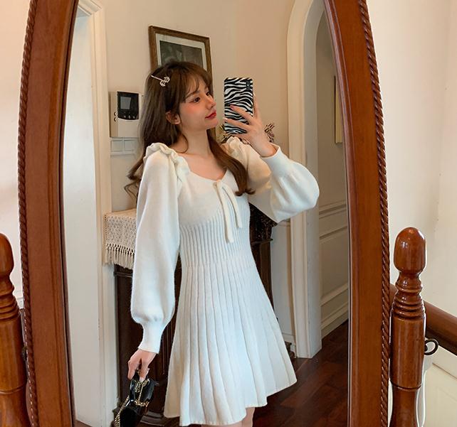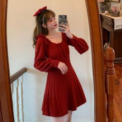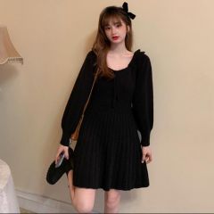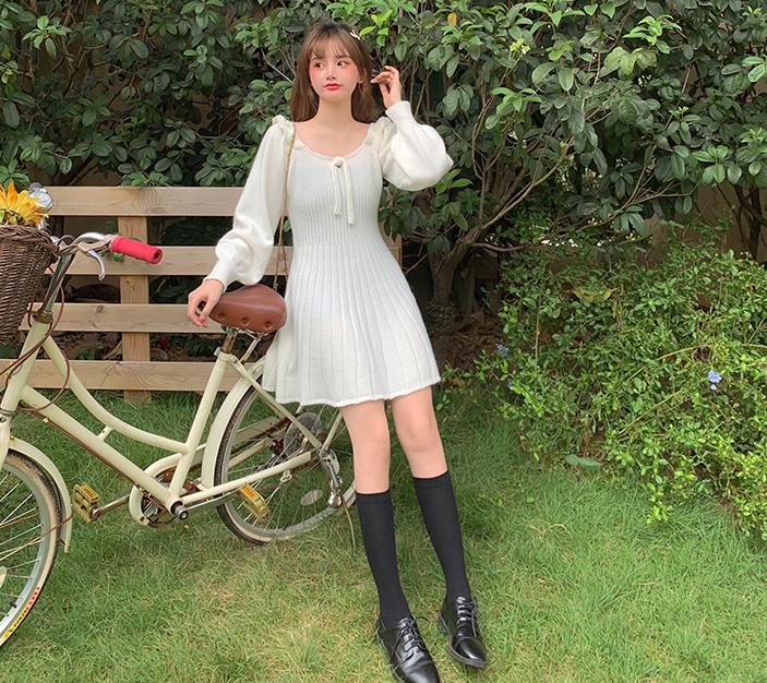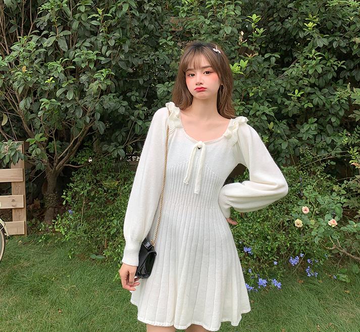 拼接木耳边针织连衣裙女2020秋季新款显瘦收腰裙子v领长袖a字短裙