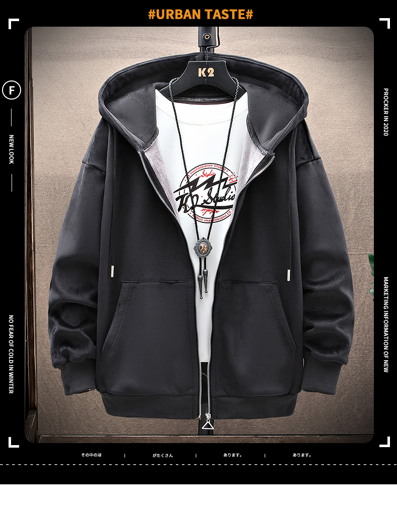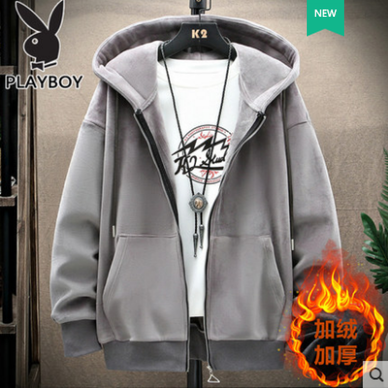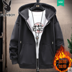 花花公子秋冬款加绒男士开衫卫衣宽松双面金丝绒加厚连帽冬装外套