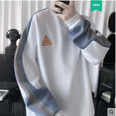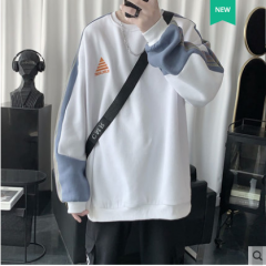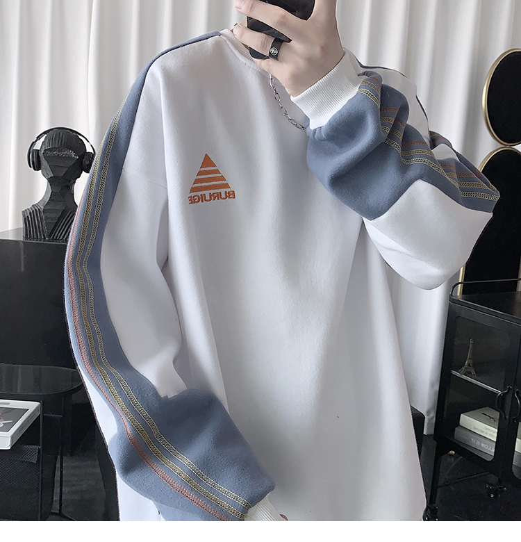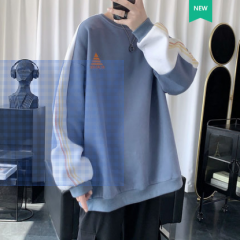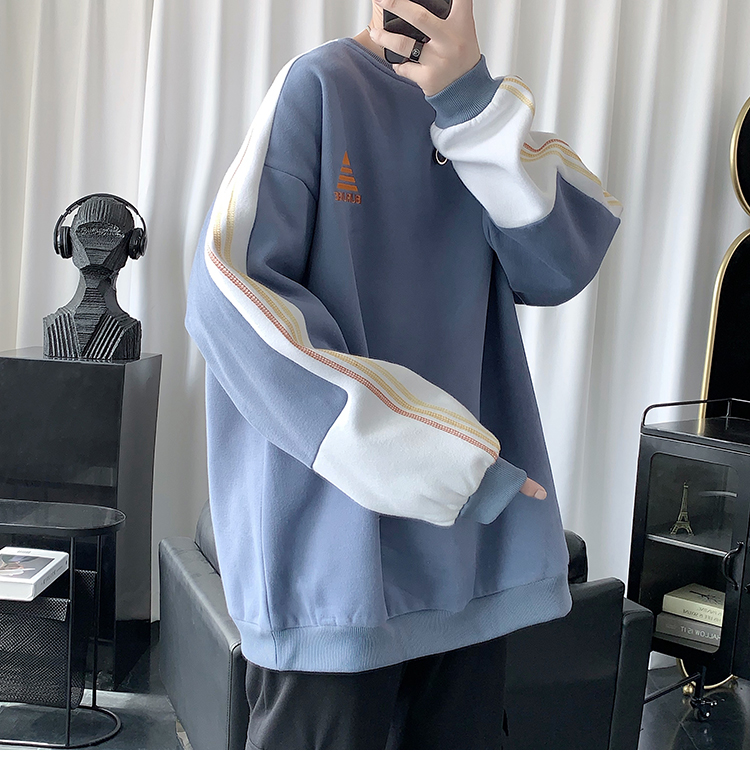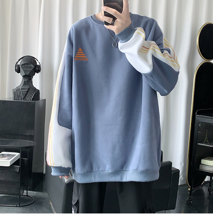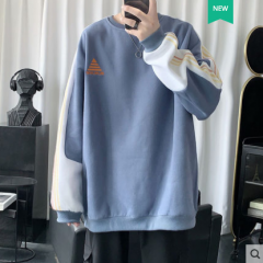 加绒卫衣男士潮牌拼色学院风圆领套头衫秋冬港风宽松潮流休闲外套