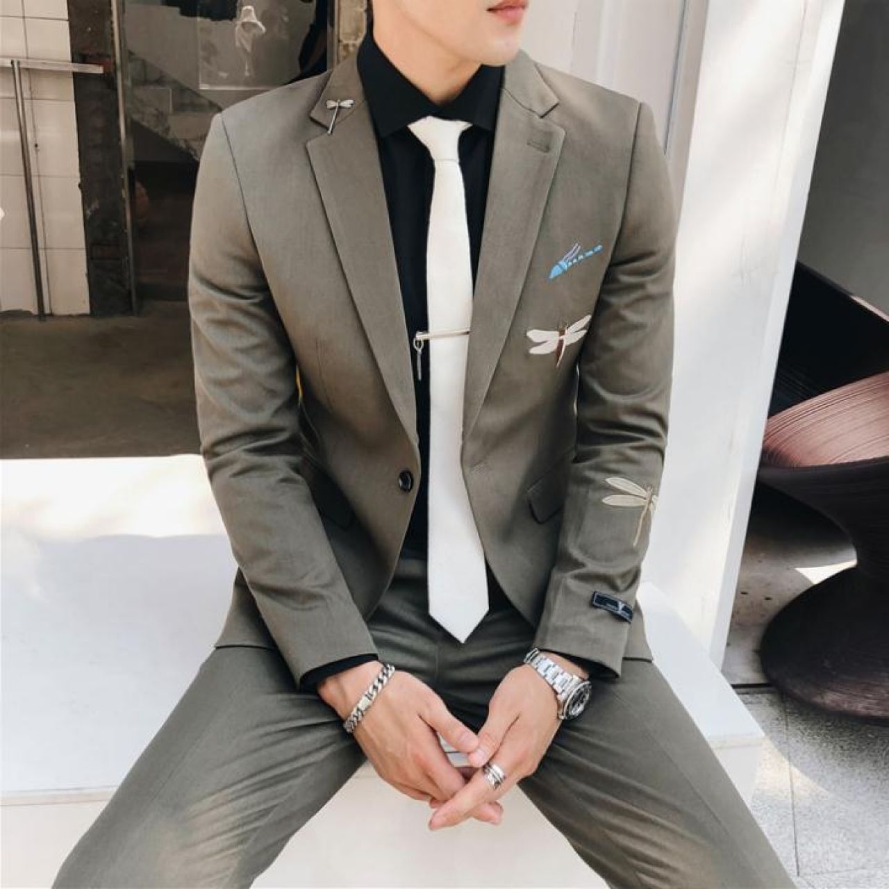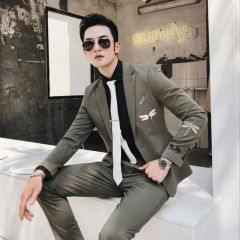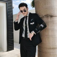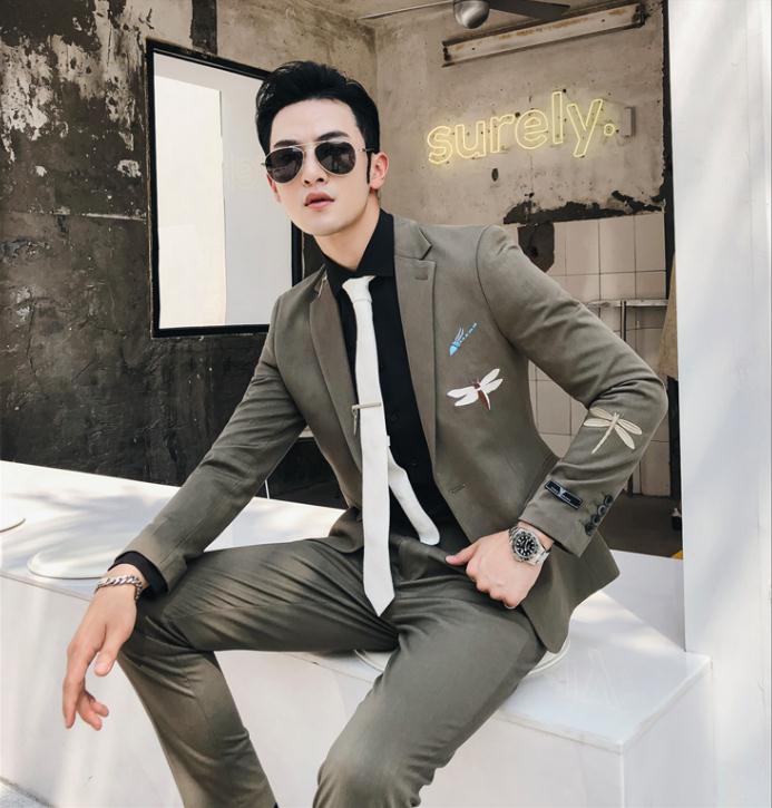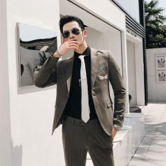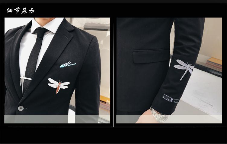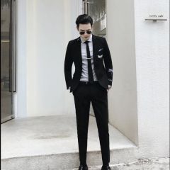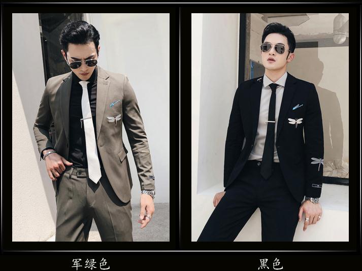 从潮流韩版修身气质条纹双排扣西服套装男发型师新郎结婚西装三件套