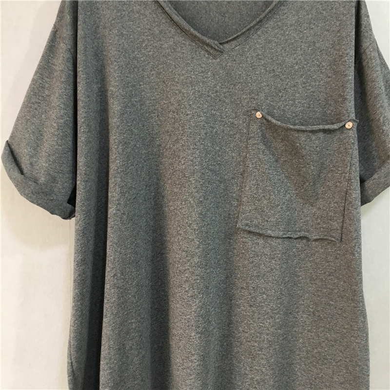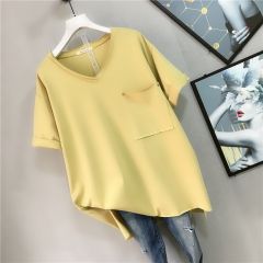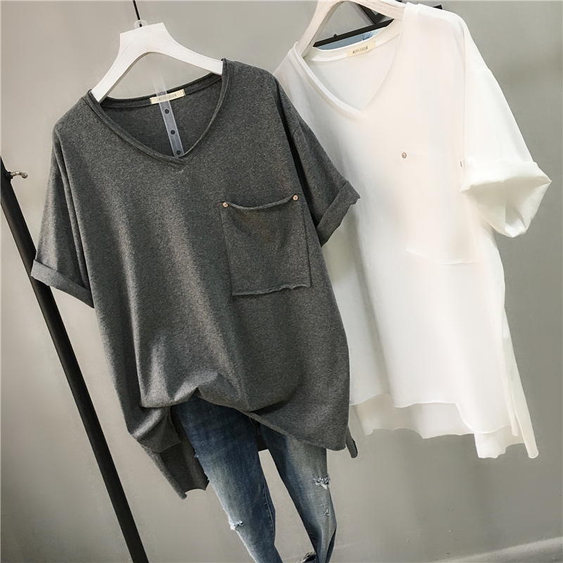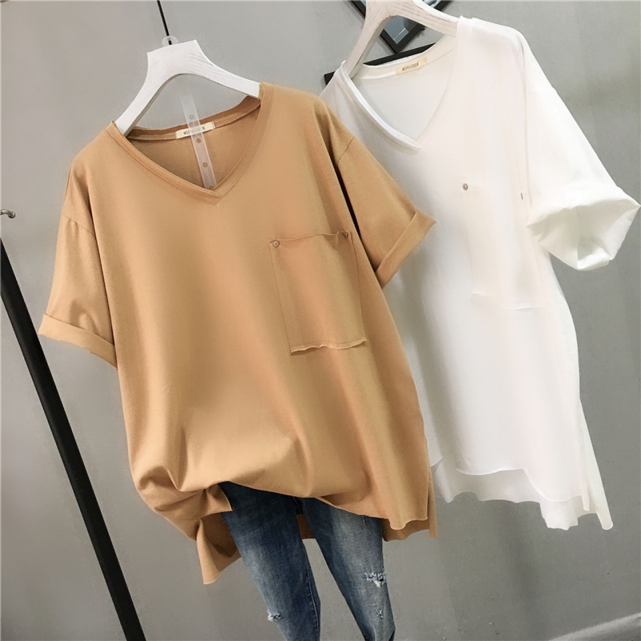 宽松纯色口袋大V领短袖t恤女夏季韩版百搭显瘦简约大码半袖上衣