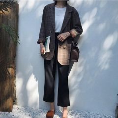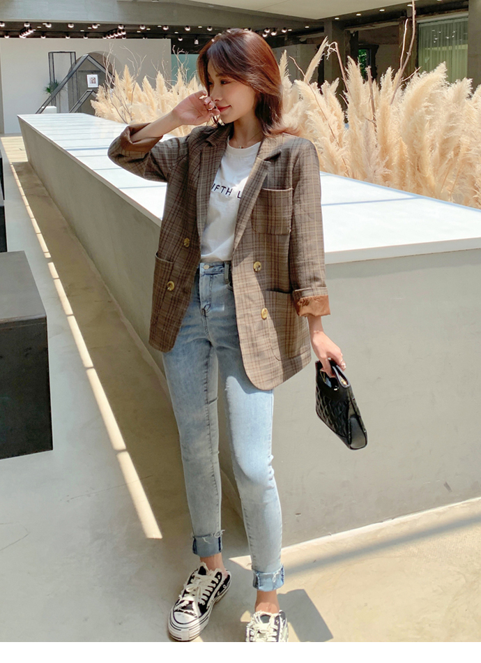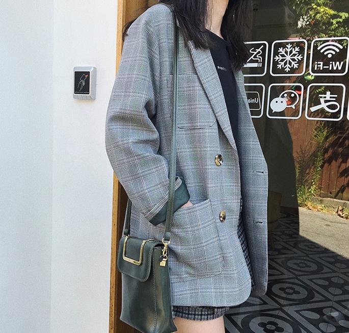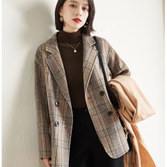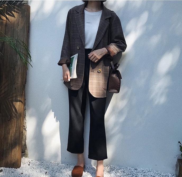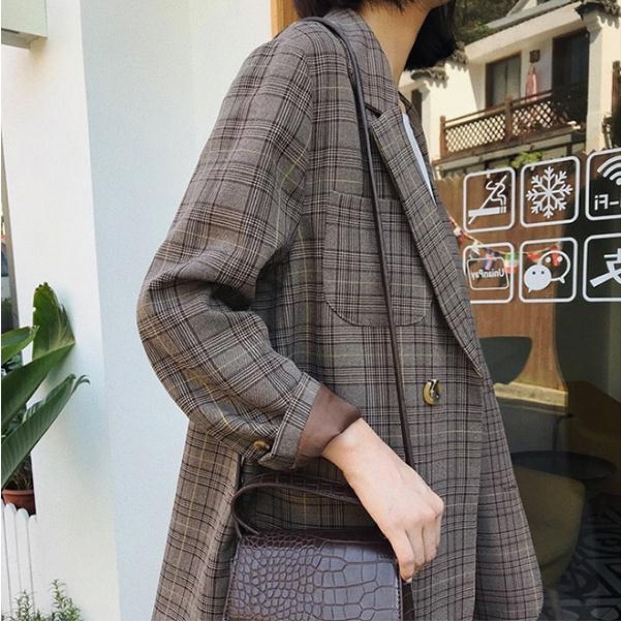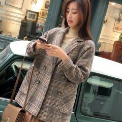 2020春秋季格子西服外套女 复古英伦棕色格纹宽松休闲小西装