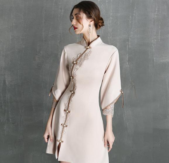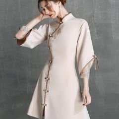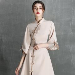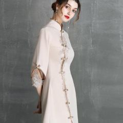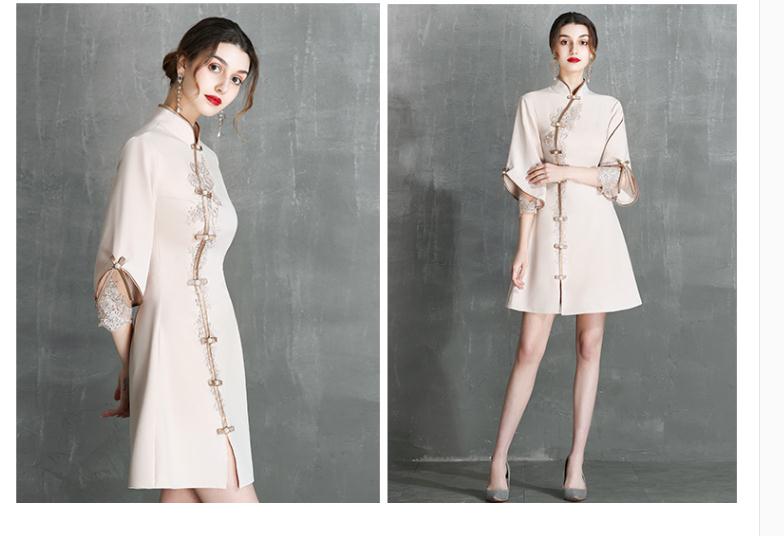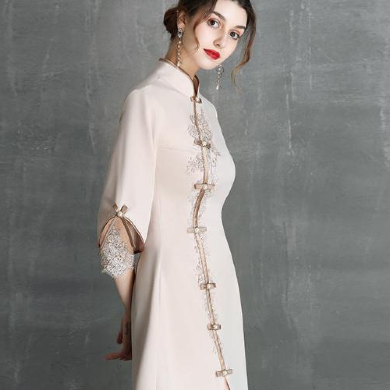 中式伴娘服仙气质2020新款秋季中国风简约长袖旗袍改良版连衣裙女