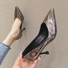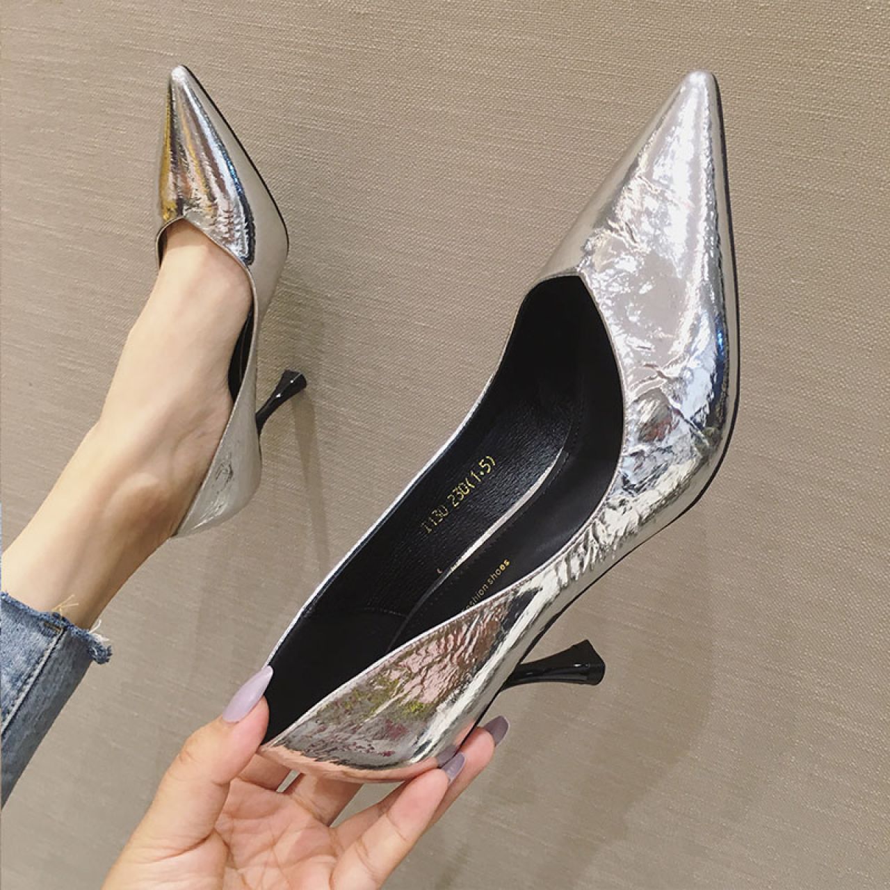 欧美枪色软皮高跟鞋女2020秋季新款时尚性感漆皮银色细跟尖头单鞋