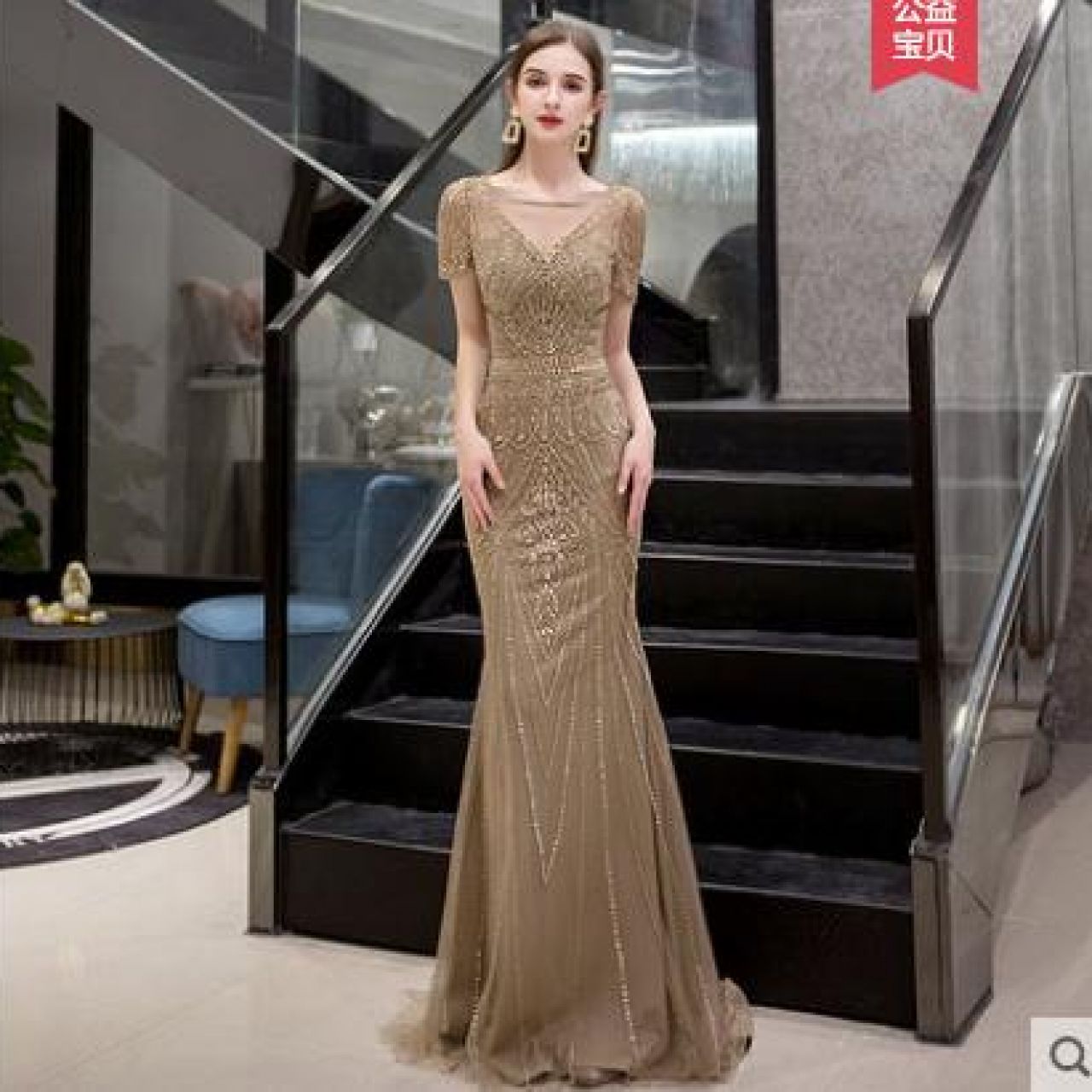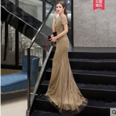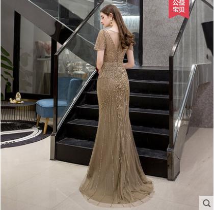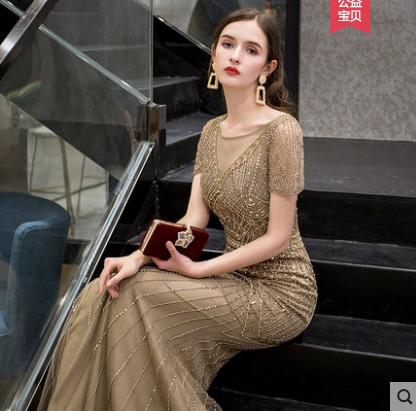 宴会鱼尾名媛高贵主持人时尚长款气场女王礼服连衣裙 高端奥钻制作 奢华名媛优雅气质 修身显瘦版