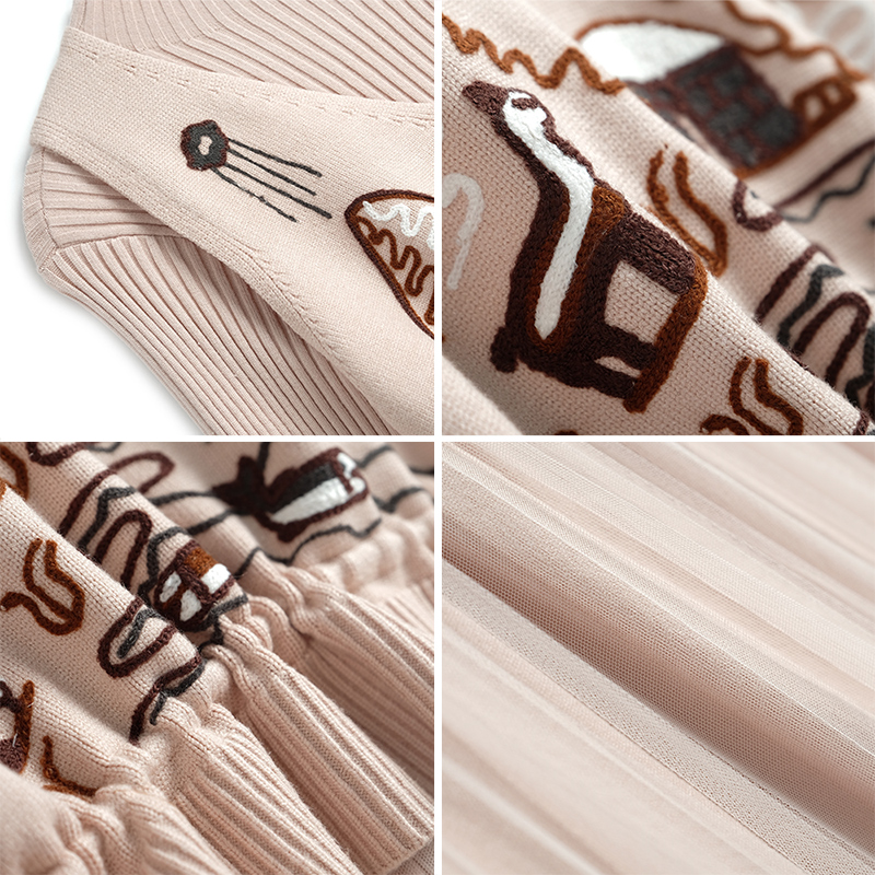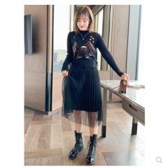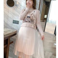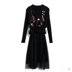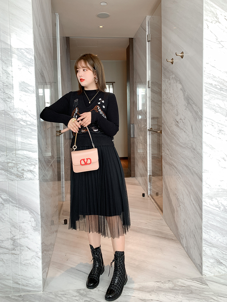MIUCO针织马甲+坑条针织拼接网纱大码连衣裙两件套女装2020秋冬新