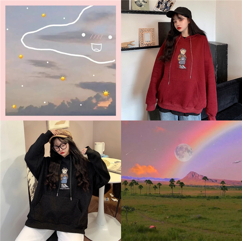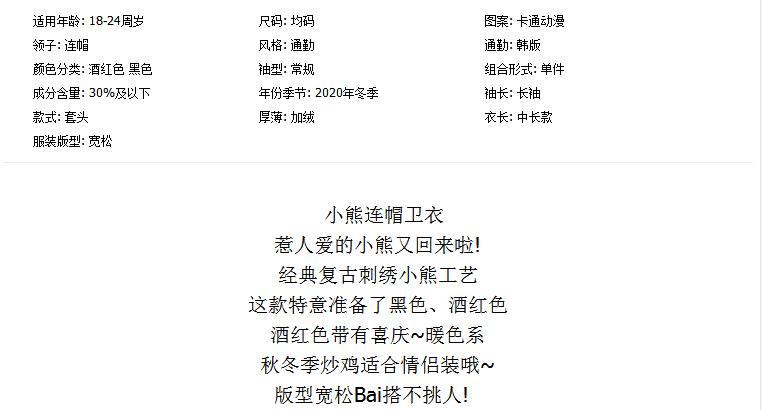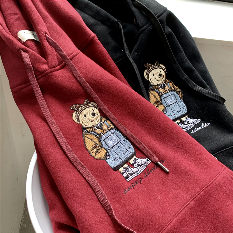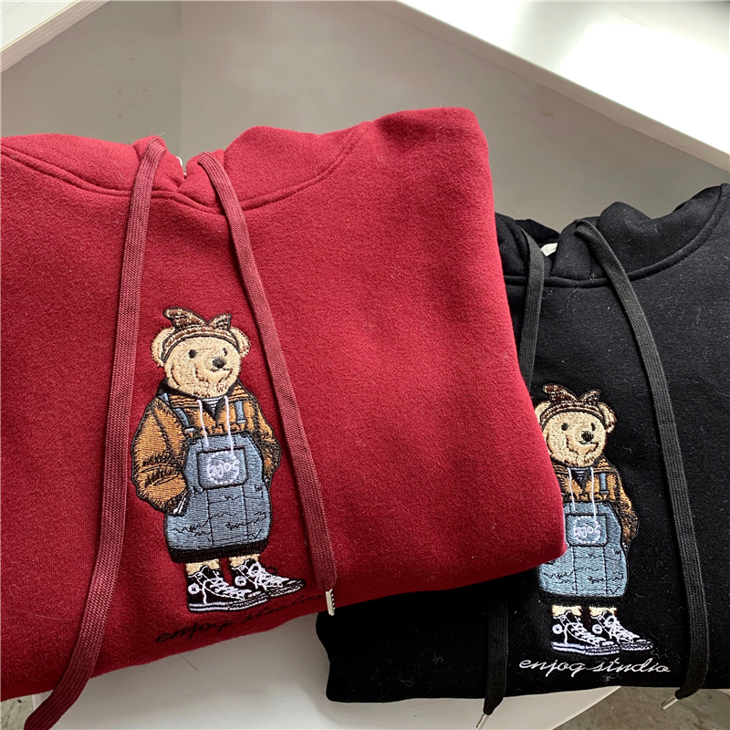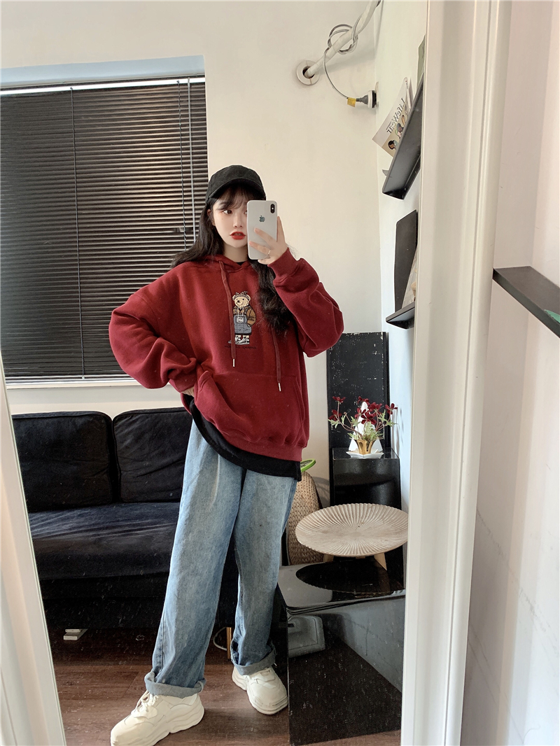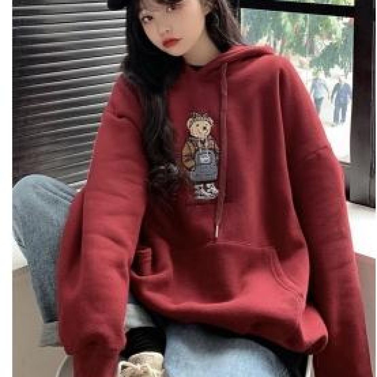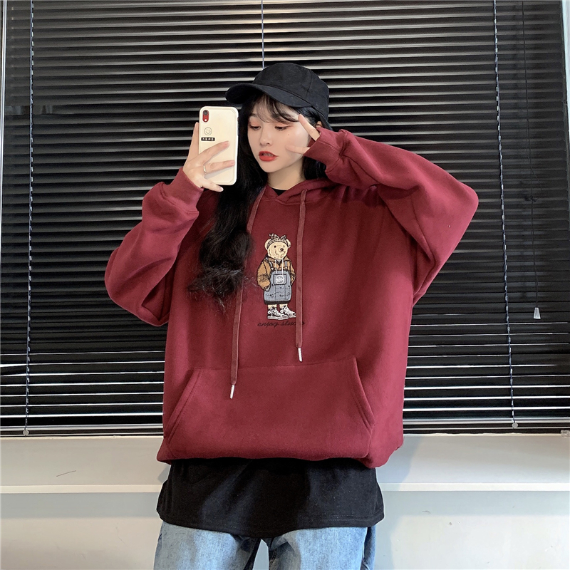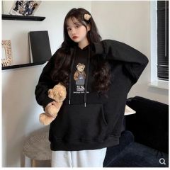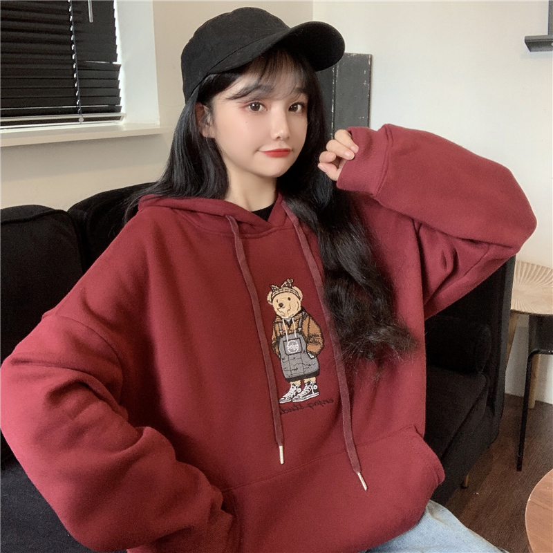 秋冬韩版2020新款宽松中长款连帽小熊刺绣加绒加厚长袖卫衣女上衣