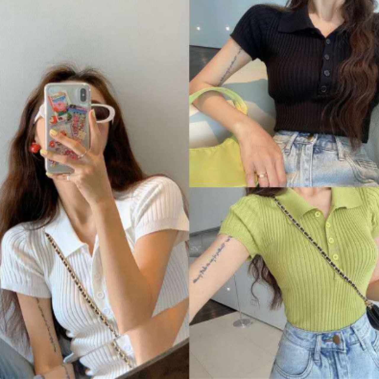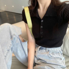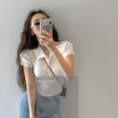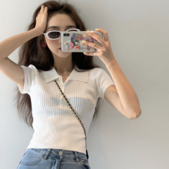 冰丝短袖女装T恤夏季短款修身瘦高腰套头针织木耳边上衣打底衫
