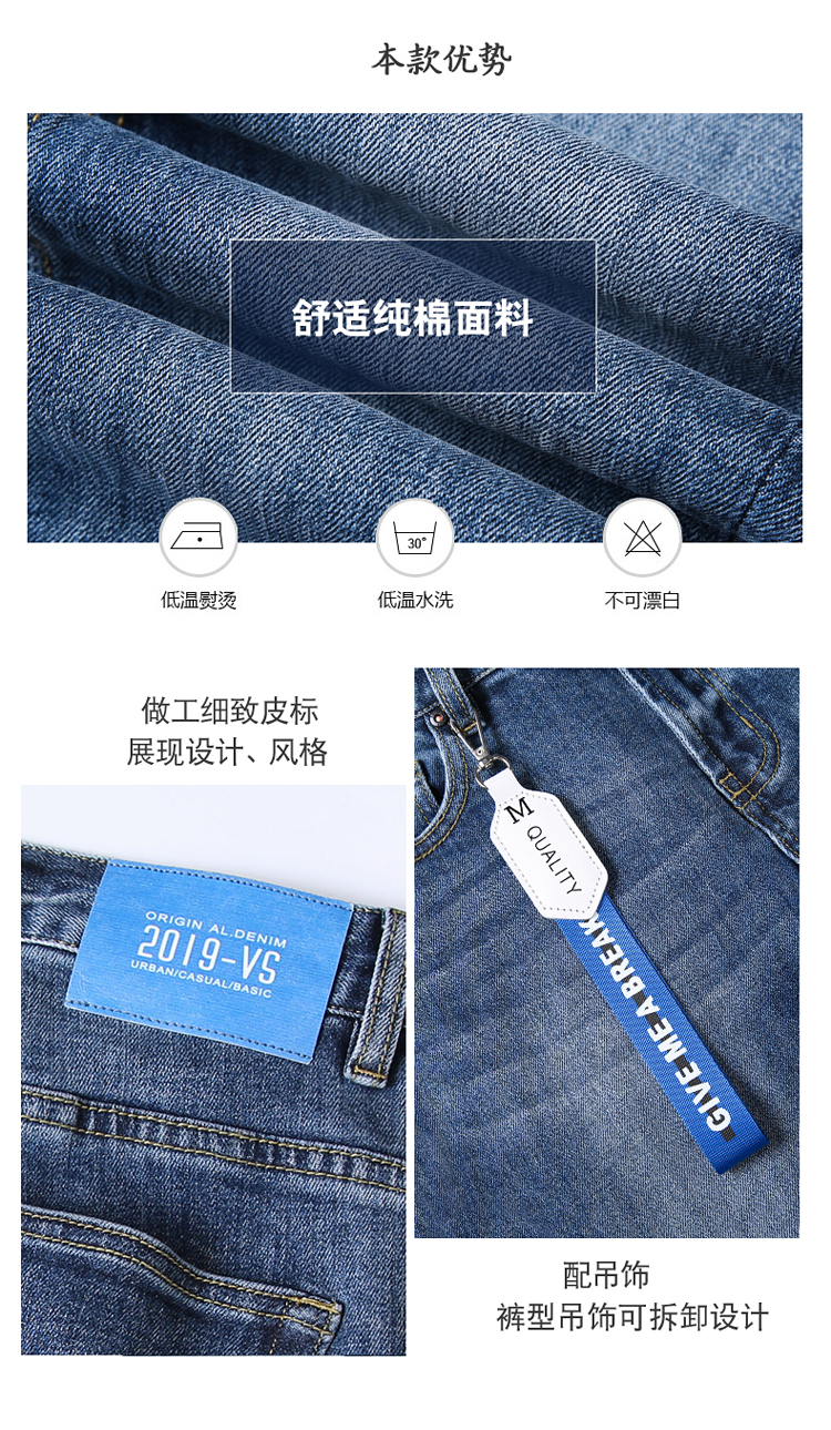 个性牛仔水洗磨白设计 简洁皮标 臀部简约设计 磨边做旧裤脚 金属拉链门禁 修身版型