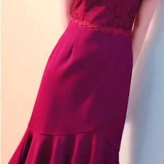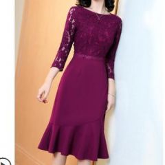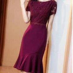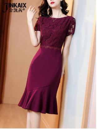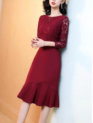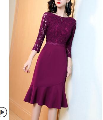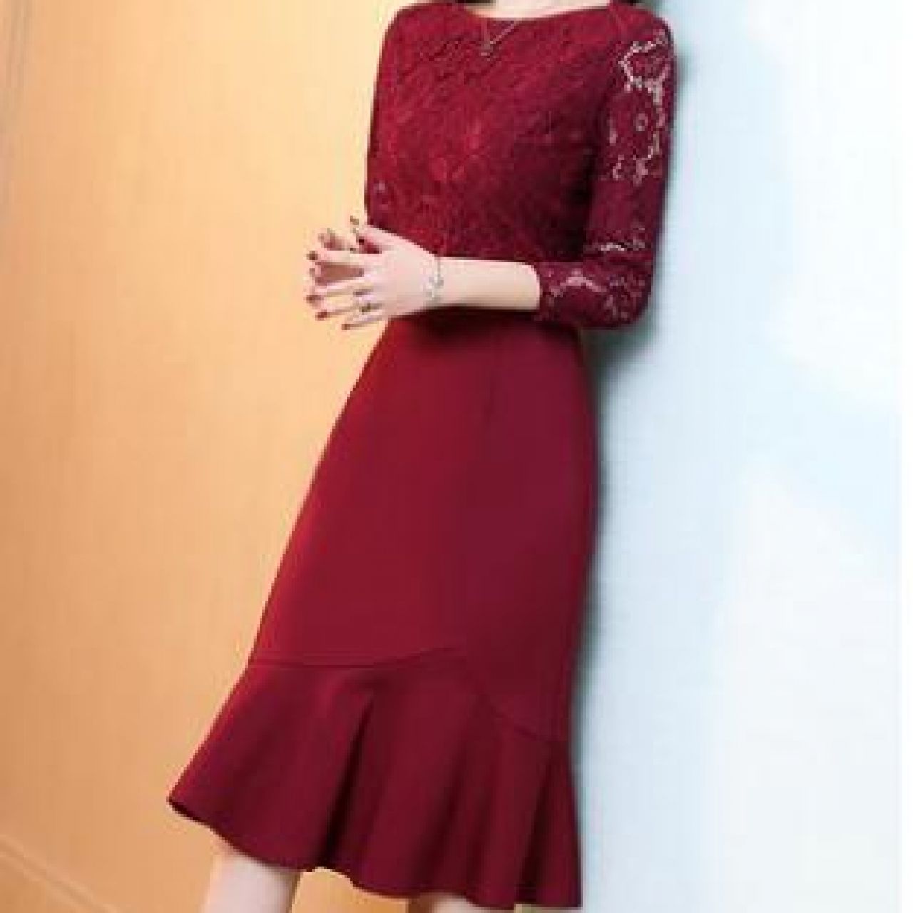 大码蕾丝连衣裙女夏长袖2020新款秋冬宴会礼服红色修身包臀鱼尾裙