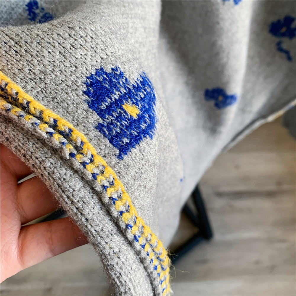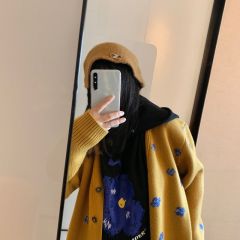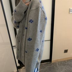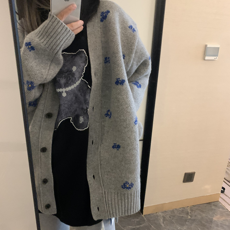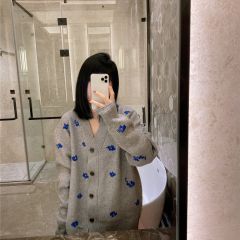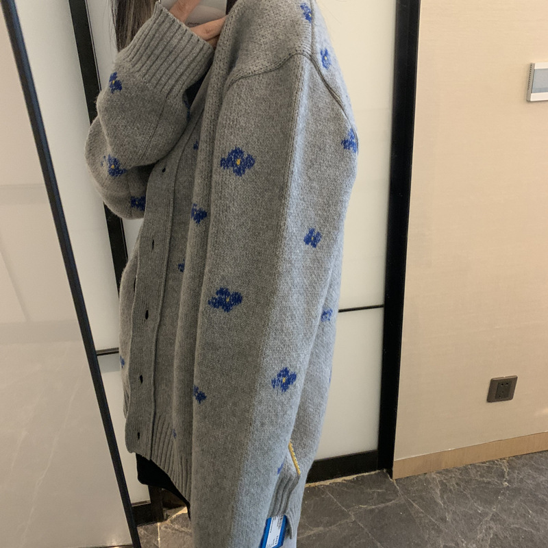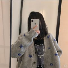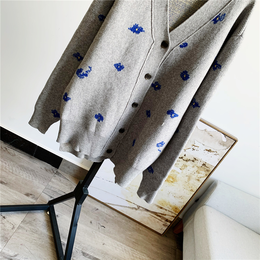 2020秋冬小众设计灰蓝配毛衣V领针织开衫女刺绣花朵提花休闲外套