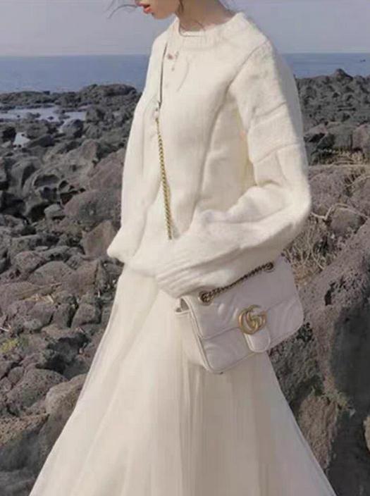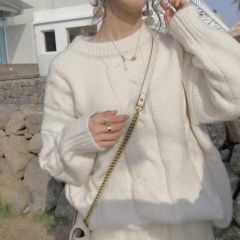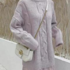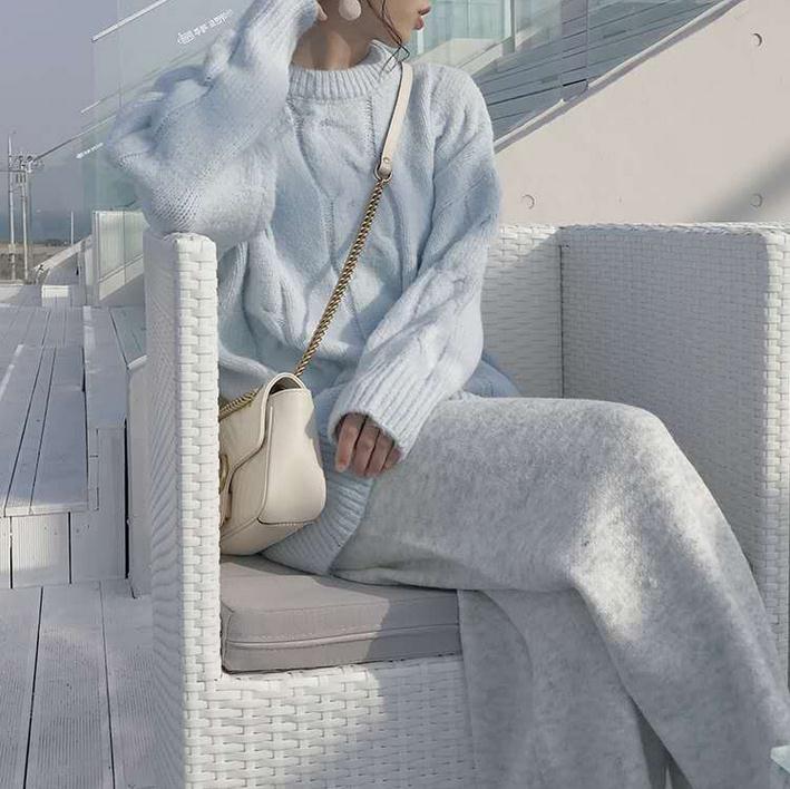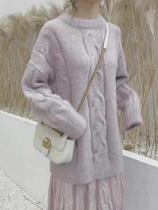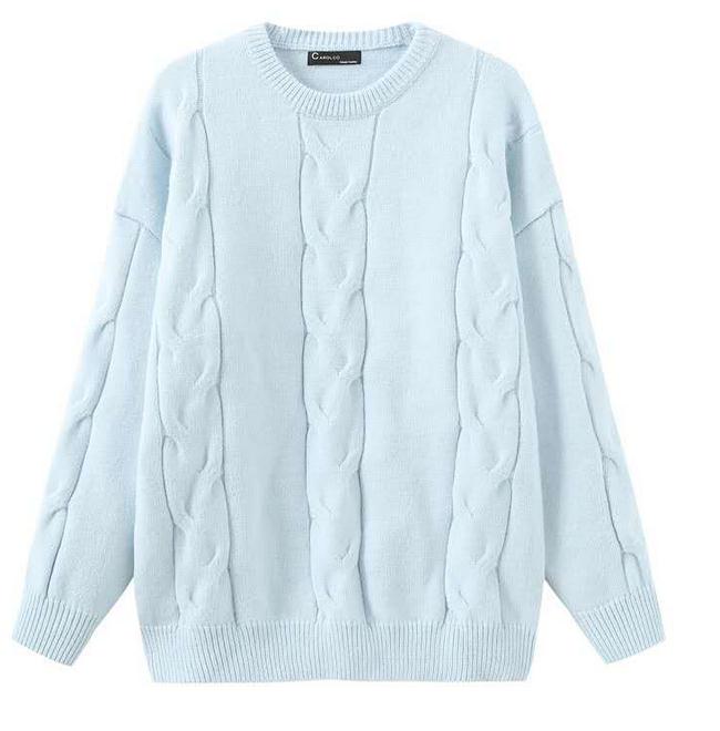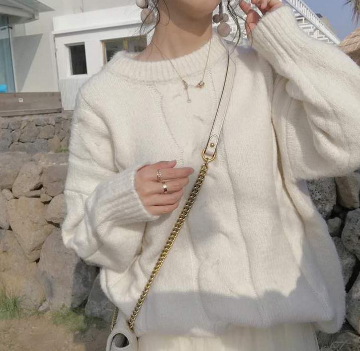 2020新款慵懒风宽松日系毛衣女秋冬外穿加厚套头麻花针织衫中长款 软奶蓝 浅粉色 米