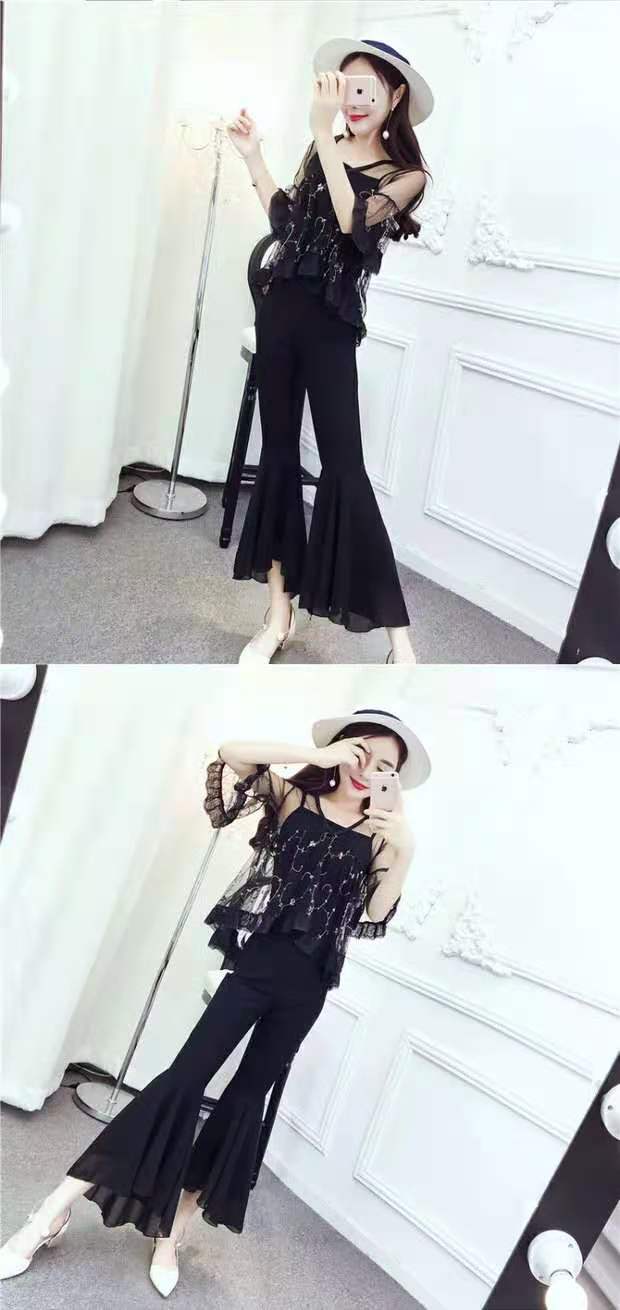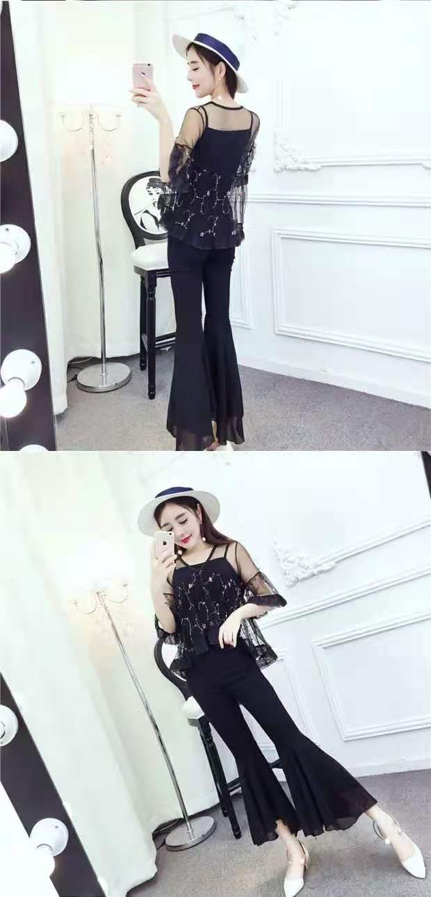 蔚缇2017夏季小花网纱+吊带+喇叭裤三件套女