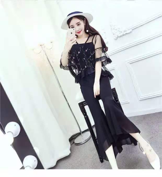 蔚缇2017夏季小花网纱+吊带+喇叭裤三件套女