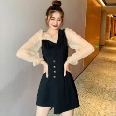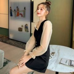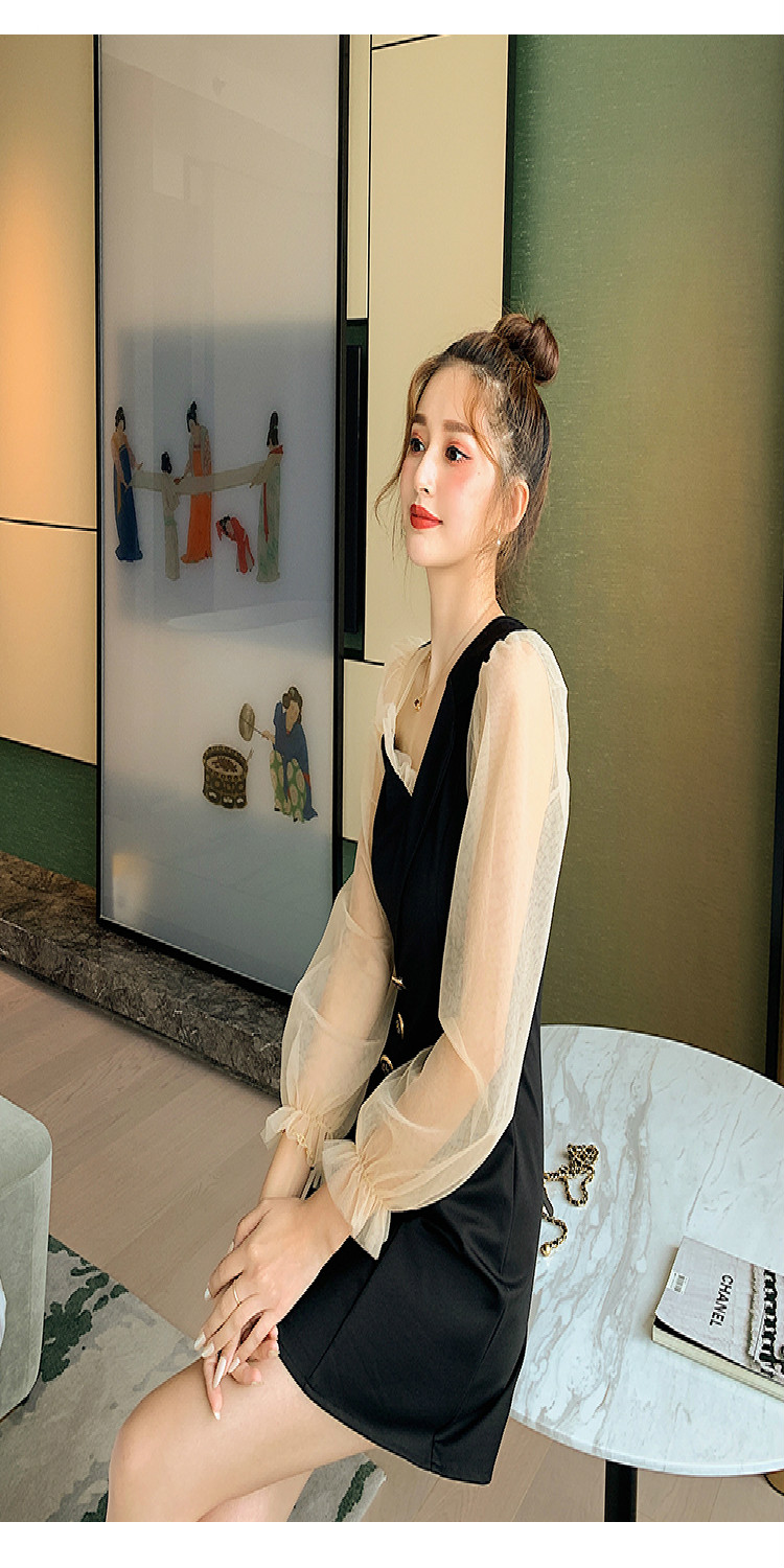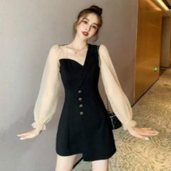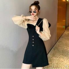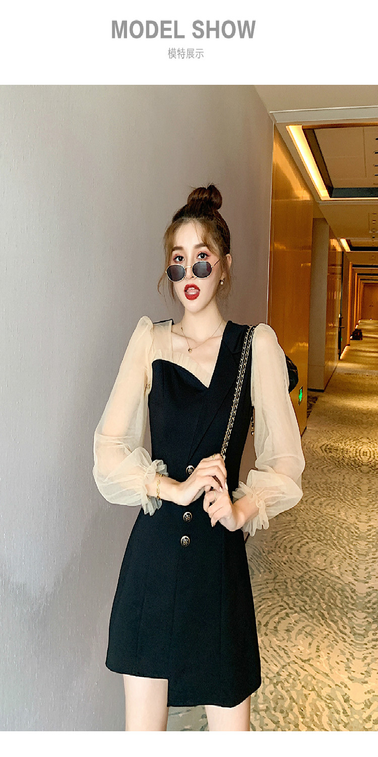 适用年龄: 18-24周岁 尺码: S M L XL 2XL 图案: 纯色 风格: 通勤 通勤: 韩版 领型: V领 腰型: 高腰 衣门襟: 单 颜色分类: 黑色 袖型: 泡泡袖 组合形式: 单件 货号: B8.13 裙型: 不规则裙 袖长: 长袖 裙长: 短裙 流行元素/工艺: 纽扣 廓形: A型